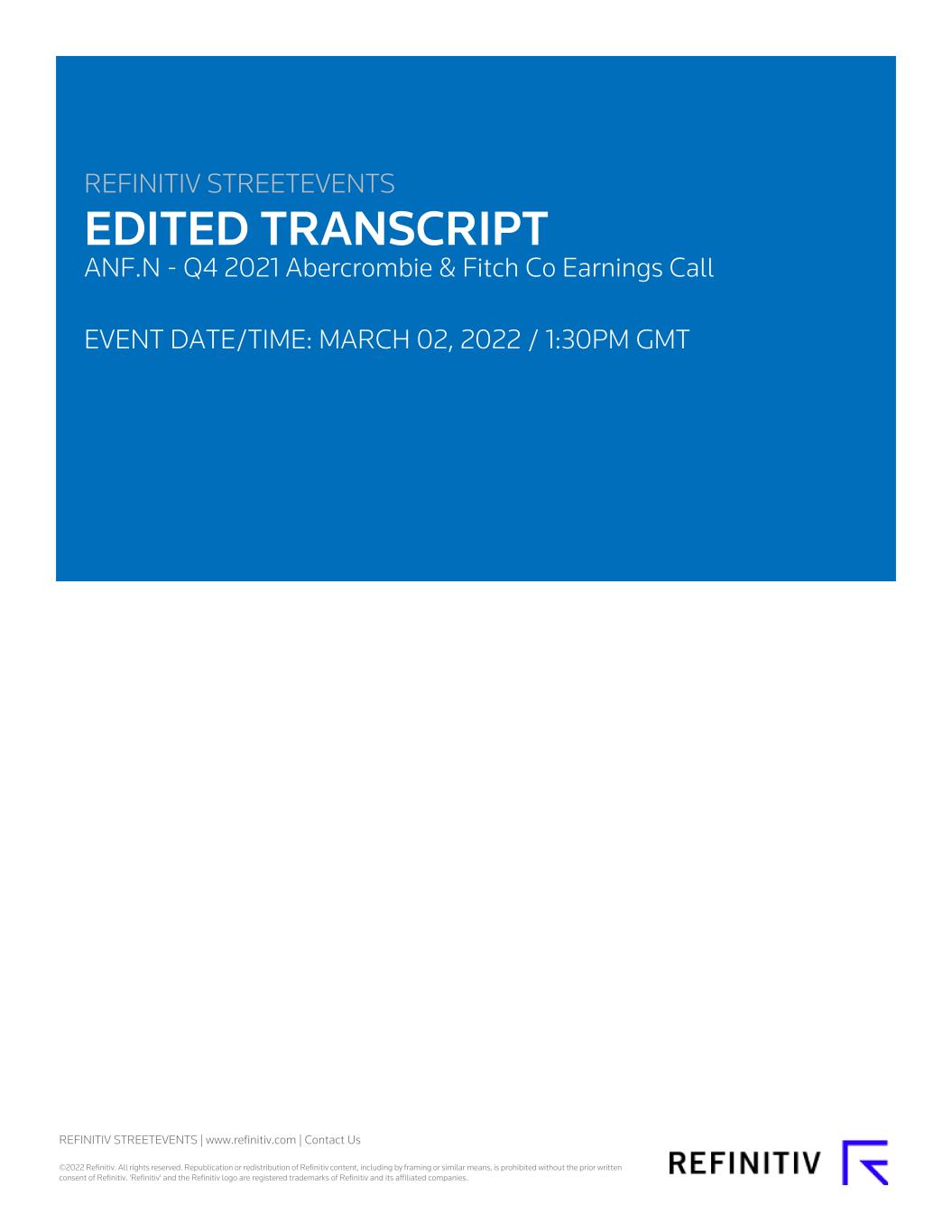 REFINITIV STREETEVENTS EDITED TRANSCRIPT ANF.N - Q4 2021 Abercrombie & Fitch Co Earnings Call EVENT DATE/TIME: MARCH 02, 2022 / 1:30PM GMT REFINITIV STREETEVENTS | www.refinitiv.com | Contact Us ©2022 Refinitiv. All rights reserved. Republication or redistribution of Refinitiv content, including by framing or similar means, is prohibited without the prior written consent of Refinitiv. 'Refinitiv' and the Refinitiv logo are registered trademarks of Refinitiv and its affiliated companies.