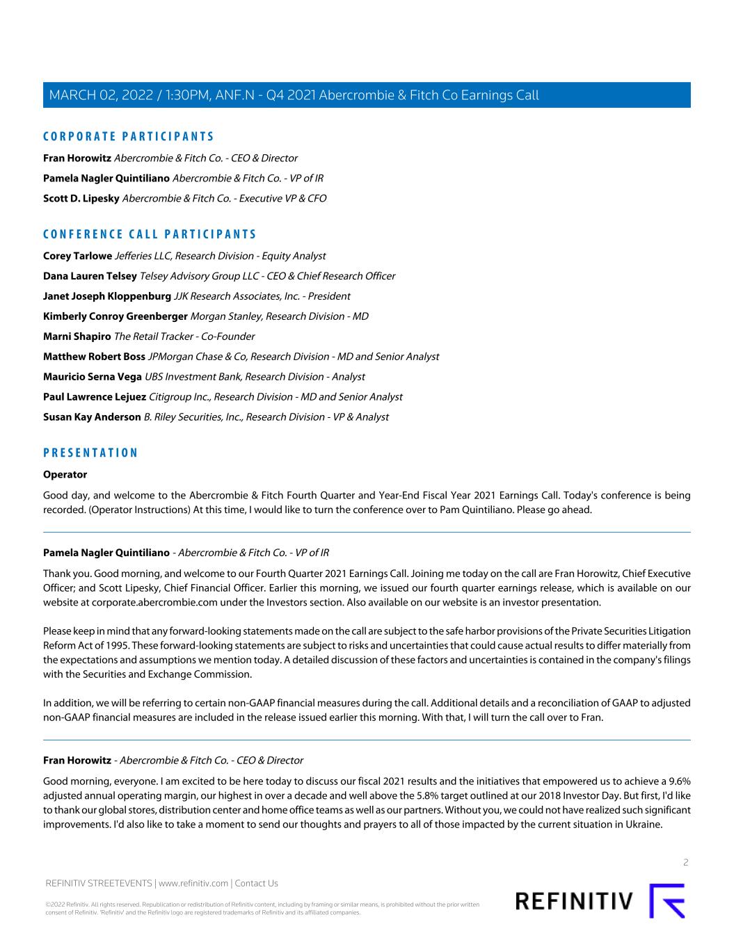 C O R P O R A T E P A R T I C I P A N T S Fran Horowitz Abercrombie & Fitch Co. - CEO & Director Pamela Nagler Quintiliano Abercrombie & Fitch Co. - VP of IR Scott D. Lipesky Abercrombie & Fitch Co. - Executive VP & CFO C O N F E R E N C E C A L L P A R T I C I P A N T S Corey Tarlowe Jefferies LLC, Research Division - Equity Analyst Dana Lauren Telsey Telsey Advisory Group LLC - CEO & Chief Research Officer Janet Joseph Kloppenburg JJK Research Associates, Inc. - President Kimberly Conroy Greenberger Morgan Stanley, Research Division - MD Marni Shapiro The Retail Tracker - Co-Founder Matthew Robert Boss JPMorgan Chase & Co, Research Division - MD and Senior Analyst Mauricio Serna Vega UBS Investment Bank, Research Division - Analyst Paul Lawrence Lejuez Citigroup Inc., Research Division - MD and Senior Analyst Susan Kay Anderson B. Riley Securities, Inc., Research Division - VP & Analyst P R E S E N T A T I O N Operator Good day, and welcome to the Abercrombie & Fitch Fourth Quarter and Year-End Fiscal Year 2021 Earnings Call. Today's conference is being recorded. (Operator Instructions) At this time, I would like to turn the conference over to Pam Quintiliano. Please go ahead. Pamela Nagler Quintiliano - Abercrombie & Fitch Co. - VP of IR Thank you. Good morning, and welcome to our Fourth Quarter 2021 Earnings Call. Joining me today on the call are Fran Horowitz, Chief Executive Officer; and Scott Lipesky, Chief Financial Officer. Earlier this morning, we issued our fourth quarter earnings release, which is available on our website at corporate.abercrombie.com under the Investors section. Also available on our website is an investor presentation. Please keep in mind that any forward-looking statements made on the call are subject to the safe harbor provisions of the Private Securities Litigation Reform Act of 1995. These forward-looking statements are subject to risks and uncertainties that could cause actual results to differ materially from the expectations and assumptions we mention today. A detailed discussion of these factors and uncertainties is contained in the company's filings with the Securities and Exchange Commission. In addition, we will be referring to certain non-GAAP financial measures during the call. Additional details and a reconciliation of GAAP to adjusted non-GAAP financial measures are included in the release issued earlier this morning. With that, I will turn the call over to Fran. Fran Horowitz - Abercrombie & Fitch Co. - CEO & Director Good morning, everyone. I am excited to be here today to discuss our fiscal 2021 results and the initiatives that empowered us to achieve a 9.6% adjusted annual operating margin, our highest in over a decade and well above the 5.8% target outlined at our 2018 Investor Day. But first, I'd like to thank our global stores, distribution center and home office teams as well as our partners. Without you, we could not have realized such significant improvements. I'd also like to take a moment to send our thoughts and prayers to all of those impacted by the current situation in Ukraine. 2 REFINITIV STREETEVENTS | www.refinitiv.com | Contact Us ©2022 Refinitiv. All rights reserved. Republication or redistribution of Refinitiv content, including by framing or similar means, is prohibited without the prior written consent of Refinitiv. 'Refinitiv' and the Refinitiv logo are registered trademarks of Refinitiv and its affiliated companies. MARCH 02, 2022 / 1:30PM, ANF.N - Q4 2021 Abercrombie & Fitch Co Earnings Call