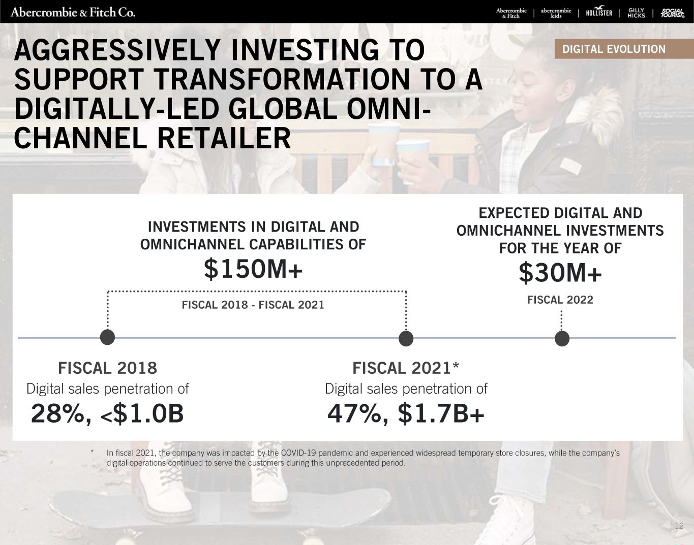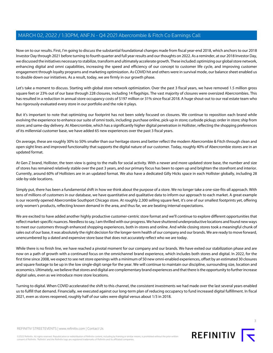 Now on to our results. First, I'm going to discuss the substantial foundational changes made from fiscal year-end 2018, which anchors to our 2018 Investor Day through 2021 before turning to fourth quarter and full year results and our thoughts on 2022. As a reminder, at our 2018 Investor Day, we discussed the initiatives necessary to stabilize, transform and ultimately accelerate growth. These included: optimizing our global store network, enhancing digital and omni capabilities, increasing the speed and efficiency of our concept to customer life cycle, and improving customer engagement through loyalty programs and marketing optimization. As COVID hit and others were in survival mode, our balance sheet enabled us to double down our initiatives. As a result, today, we are firmly in our growth phase. Let's take a moment to discuss. Starting with global store network optimization. Over the past 3 fiscal years, we have removed 1.5 million gross square feet or 23% out of our base through 228 closures, including 14 flagships. The vast majority of closures were oversized Abercrombies. This has resulted in a reduction in annual store occupancy costs of $197 million or 31% since fiscal 2018. A huge shout-out to our real estate team who has rigorously evaluated every store in our portfolio and the role it plays. But it's important to note that optimizing our footprint has not been solely focused on closures. We continue to reposition each brand while evolving the experience to enhance our suite of omni tools, including: purchase online, pick-up in store; curbside pickup; order in store; ship from store; and same-day delivery. At Abercrombie, which has a significantly higher digital penetration in Hollister, reflecting the shopping preferences of its millennial customer base, we have added 65 new experiences over the past 3 fiscal years. On average, these are roughly 30% to 50% smaller than our heritage stores and better reflect the modern Abercrombie & Fitch through clean and open sight lines and improved functionality that supports the digital nature of our customer. Today, roughly 40% of Abercrombie stores are in an updated format. At Gen Z brand, Hollister, the teen view is going to the malls for social activity. With a newer and more updated store base, the number and size of stores has remained relatively stable over the past 3 years, and our primary focus has been to open up and brighten the storefront and interior. Currently, around 60% of Hollisters are in an updated format. We also have a dedicated Gilly Hicks space in each Hollister globally, including 28 side-by-side locations. Simply put, there has been a fundamental shift in how we think about the purpose of a store. We no longer take a one-size-fits-all approach. With tens of millions of customers in our database, we have quantitative and qualitative data to inform our approach to each market. A great example is our recently opened Abercrombie Southport Chicago store. At roughly 2,300 selling square feet, it's one of our smallest footprints yet, offering only women's products, reflecting known demand in the area, and thus far, we are beating internal expectations. We are excited to have added another highly productive customer-centric store format and we'll continue to explore different opportunities that reflect market-specific nuances. Needless to say, I am thrilled with our progress. We have shuttered underproductive locations and found new ways to meet our customers through enhanced shopping experiences, both in-stores and online. And while closing stores took a meaningful chunk of sales out of our base, it was absolutely the right decision for the longer-term health of our company and our brands. We are ready to move forward, unencumbered by a dated and expensive store base that does not accurately reflect who we are today. While there is no finish line, we have reached a pivotal moment for our company and our brands. We have exited our stabilization phase and are now on a path of growth with a continued focus on the omnichannel brand experience, which includes both stores and digital. In 2022, for the first time since 2008, we expect to see net store openings with a minimum of 50 new omni-enabled experiences, offset by an estimated 30 closures and square footage to be up in the low single-digit range for the year. We will continue to maintain our discipline, surrounding size, location and economics. Ultimately, we believe that stores and digital are complementary brand experiences and that there is the opportunity to further increase digital sales, even as we introduce more store locations. Turning to digital. When COVID accelerated the shift to this channel, the consistent investments we had made over the last several years enabled us to fulfill that demand. Financially, we executed against our long-term plan of reducing occupancy to fund increased digital fulfillment. In fiscal 2021, even as stores reopened, roughly half of our sales were digital versus about 1/3 in 2018. 3 REFINITIV STREETEVENTS | www.refinitiv.com | Contact Us ©2022 Refinitiv. All rights reserved. Republication or redistribution of Refinitiv content, including by framing or similar means, is prohibited without the prior written consent of Refinitiv. 'Refinitiv' and the Refinitiv logo are registered trademarks of Refinitiv and its affiliated companies. MARCH 02, 2022 / 1:30PM, ANF.N - Q4 2021 Abercrombie & Fitch Co Earnings Call