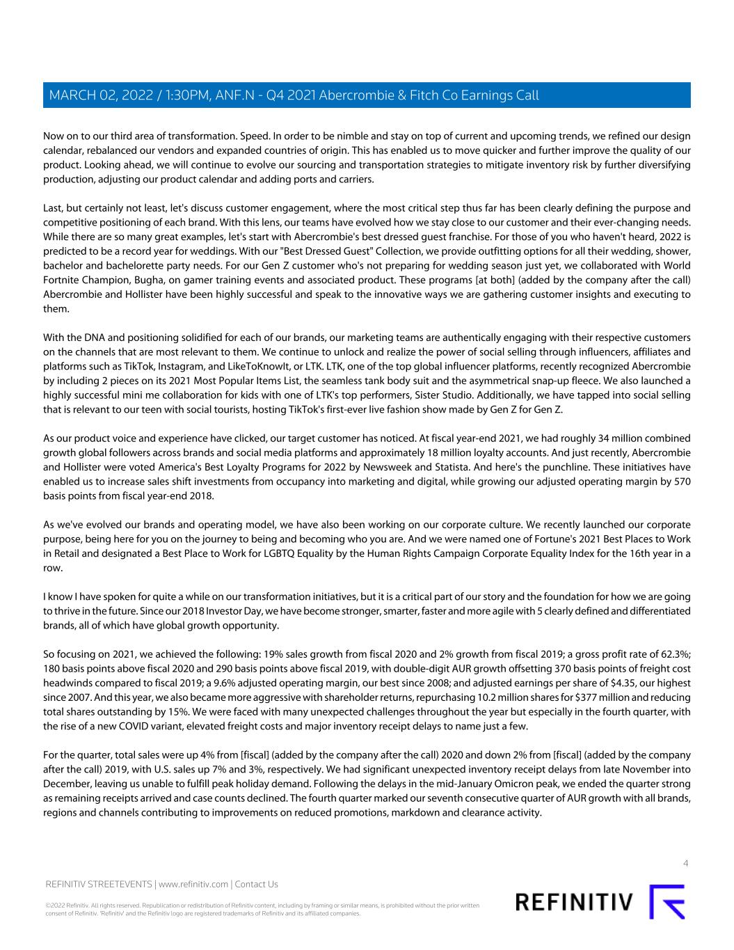 Now on to our third area of transformation. Speed. In order to be nimble and stay on top of current and upcoming trends, we refined our design calendar, rebalanced our vendors and expanded countries of origin. This has enabled us to move quicker and further improve the quality of our product. Looking ahead, we will continue to evolve our sourcing and transportation strategies to mitigate inventory risk by further diversifying production, adjusting our product calendar and adding ports and carriers. Last, but certainly not least, let's discuss customer engagement, where the most critical step thus far has been clearly defining the purpose and competitive positioning of each brand. With this lens, our teams have evolved how we stay close to our customer and their ever-changing needs. While there are so many great examples, let's start with Abercrombie's best dressed guest franchise. For those of you who haven't heard, 2022 is predicted to be a record year for weddings. With our "Best Dressed Guest" Collection, we provide outfitting options for all their wedding, shower, bachelor and bachelorette party needs. For our Gen Z customer who's not preparing for wedding season just yet, we collaborated with World Fortnite Champion, Bugha, on gamer training events and associated product. These programs [at both] (added by the company after the call) Abercrombie and Hollister have been highly successful and speak to the innovative ways we are gathering customer insights and executing to them. With the DNA and positioning solidified for each of our brands, our marketing teams are authentically engaging with their respective customers on the channels that are most relevant to them. We continue to unlock and realize the power of social selling through influencers, affiliates and platforms such as TikTok, Instagram, and LikeToKnowIt, or LTK. LTK, one of the top global influencer platforms, recently recognized Abercrombie by including 2 pieces on its 2021 Most Popular Items List, the seamless tank body suit and the asymmetrical snap-up fleece. We also launched a highly successful mini me collaboration for kids with one of LTK's top performers, Sister Studio. Additionally, we have tapped into social selling that is relevant to our teen with social tourists, hosting TikTok's first-ever live fashion show made by Gen Z for Gen Z. As our product voice and experience have clicked, our target customer has noticed. At fiscal year-end 2021, we had roughly 34 million combined growth global followers across brands and social media platforms and approximately 18 million loyalty accounts. And just recently, Abercrombie and Hollister were voted America's Best Loyalty Programs for 2022 by Newsweek and Statista. And here's the punchline. These initiatives have enabled us to increase sales shift investments from occupancy into marketing and digital, while growing our adjusted operating margin by 570 basis points from fiscal year-end 2018. As we've evolved our brands and operating model, we have also been working on our corporate culture. We recently launched our corporate purpose, being here for you on the journey to being and becoming who you are. And we were named one of Fortune's 2021 Best Places to Work in Retail and designated a Best Place to Work for LGBTQ Equality by the Human Rights Campaign Corporate Equality Index for the 16th year in a row. I know I have spoken for quite a while on our transformation initiatives, but it is a critical part of our story and the foundation for how we are going to thrive in the future. Since our 2018 Investor Day, we have become stronger, smarter, faster and more agile with 5 clearly defined and differentiated brands, all of which have global growth opportunity. So focusing on 2021, we achieved the following: 19% sales growth from fiscal 2020 and 2% growth from fiscal 2019; a gross profit rate of 62.3%; 180 basis points above fiscal 2020 and 290 basis points above fiscal 2019, with double-digit AUR growth offsetting 370 basis points of freight cost headwinds compared to fiscal 2019; a 9.6% adjusted operating margin, our best since 2008; and adjusted earnings per share of $4.35, our highest since 2007. And this year, we also became more aggressive with shareholder returns, repurchasing 10.2 million shares for $377 million and reducing total shares outstanding by 15%. We were faced with many unexpected challenges throughout the year but especially in the fourth quarter, with the rise of a new COVID variant, elevated freight costs and major inventory receipt delays to name just a few. For the quarter, total sales were up 4% from [fiscal] (added by the company after the call) 2020 and down 2% from [fiscal] (added by the company after the call) 2019, with U.S. sales up 7% and 3%, respectively. We had significant unexpected inventory receipt delays from late November into December, leaving us unable to fulfill peak holiday demand. Following the delays in the mid-January Omicron peak, we ended the quarter strong as remaining receipts arrived and case counts declined. The fourth quarter marked our seventh consecutive quarter of AUR growth with all brands, regions and channels contributing to improvements on reduced promotions, markdown and clearance activity. 4 REFINITIV STREETEVENTS | www.refinitiv.com | Contact Us ©2022 Refinitiv. All rights reserved. Republication or redistribution of Refinitiv content, including by framing or similar means, is prohibited without the prior written consent of Refinitiv. 'Refinitiv' and the Refinitiv logo are registered trademarks of Refinitiv and its affiliated companies. MARCH 02, 2022 / 1:30PM, ANF.N - Q4 2021 Abercrombie & Fitch Co Earnings Call
