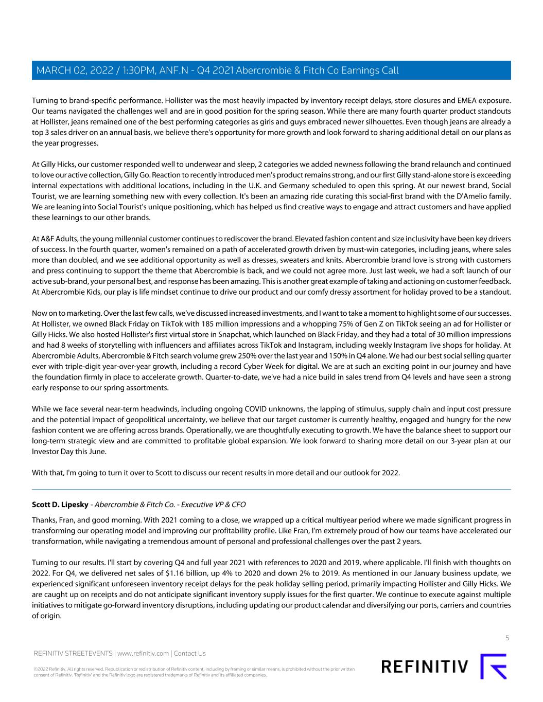 Turning to brand-specific performance. Hollister was the most heavily impacted by inventory receipt delays, store closures and EMEA exposure. Our teams navigated the challenges well and are in good position for the spring season. While there are many fourth quarter product standouts at Hollister, jeans remained one of the best performing categories as girls and guys embraced newer silhouettes. Even though jeans are already a top 3 sales driver on an annual basis, we believe there's opportunity for more growth and look forward to sharing additional detail on our plans as the year progresses. At Gilly Hicks, our customer responded well to underwear and sleep, 2 categories we added newness following the brand relaunch and continued to love our active collection, Gilly Go. Reaction to recently introduced men's product remains strong, and our first Gilly stand-alone store is exceeding internal expectations with additional locations, including in the U.K. and Germany scheduled to open this spring. At our newest brand, Social Tourist, we are learning something new with every collection. It's been an amazing ride curating this social-first brand with the D'Amelio family. We are leaning into Social Tourist's unique positioning, which has helped us find creative ways to engage and attract customers and have applied these learnings to our other brands. At A&F Adults, the young millennial customer continues to rediscover the brand. Elevated fashion content and size inclusivity have been key drivers of success. In the fourth quarter, women's remained on a path of accelerated growth driven by must-win categories, including jeans, where sales more than doubled, and we see additional opportunity as well as dresses, sweaters and knits. Abercrombie brand love is strong with customers and press continuing to support the theme that Abercrombie is back, and we could not agree more. Just last week, we had a soft launch of our active sub-brand, your personal best, and response has been amazing. This is another great example of taking and actioning on customer feedback. At Abercrombie Kids, our play is life mindset continue to drive our product and our comfy dressy assortment for holiday proved to be a standout. Now on to marketing. Over the last few calls, we've discussed increased investments, and I want to take a moment to highlight some of our successes. At Hollister, we owned Black Friday on TikTok with 185 million impressions and a whopping 75% of Gen Z on TikTok seeing an ad for Hollister or Gilly Hicks. We also hosted Hollister's first virtual store in Snapchat, which launched on Black Friday, and they had a total of 30 million impressions and had 8 weeks of storytelling with influencers and affiliates across TikTok and Instagram, including weekly Instagram live shops for holiday. At Abercrombie Adults, Abercrombie & Fitch search volume grew 250% over the last year and 150% in Q4 alone. We had our best social selling quarter ever with triple-digit year-over-year growth, including a record Cyber Week for digital. We are at such an exciting point in our journey and have the foundation firmly in place to accelerate growth. Quarter-to-date, we've had a nice build in sales trend from Q4 levels and have seen a strong early response to our spring assortments. While we face several near-term headwinds, including ongoing COVID unknowns, the lapping of stimulus, supply chain and input cost pressure and the potential impact of geopolitical uncertainty, we believe that our target customer is currently healthy, engaged and hungry for the new fashion content we are offering across brands. Operationally, we are thoughtfully executing to growth. We have the balance sheet to support our long-term strategic view and are committed to profitable global expansion. We look forward to sharing more detail on our 3-year plan at our Investor Day this June. With that, I'm going to turn it over to Scott to discuss our recent results in more detail and our outlook for 2022. Scott D. Lipesky - Abercrombie & Fitch Co. - Executive VP & CFO Thanks, Fran, and good morning. With 2021 coming to a close, we wrapped up a critical multiyear period where we made significant progress in transforming our operating model and improving our profitability profile. Like Fran, I'm extremely proud of how our teams have accelerated our transformation, while navigating a tremendous amount of personal and professional challenges over the past 2 years. Turning to our results. I'll start by covering Q4 and full year 2021 with references to 2020 and 2019, where applicable. I'll finish with thoughts on 2022. For Q4, we delivered net sales of $1.16 billion, up 4% to 2020 and down 2% to 2019. As mentioned in our January business update, we experienced significant unforeseen inventory receipt delays for the peak holiday selling period, primarily impacting Hollister and Gilly Hicks. We are caught up on receipts and do not anticipate significant inventory supply issues for the first quarter. We continue to execute against multiple initiatives to mitigate go-forward inventory disruptions, including updating our product calendar and diversifying our ports, carriers and countries of origin. 5 REFINITIV STREETEVENTS | www.refinitiv.com | Contact Us ©2022 Refinitiv. All rights reserved. Republication or redistribution of Refinitiv content, including by framing or similar means, is prohibited without the prior written consent of Refinitiv. 'Refinitiv' and the Refinitiv logo are registered trademarks of Refinitiv and its affiliated companies. MARCH 02, 2022 / 1:30PM, ANF.N - Q4 2021 Abercrombie & Fitch Co Earnings Call