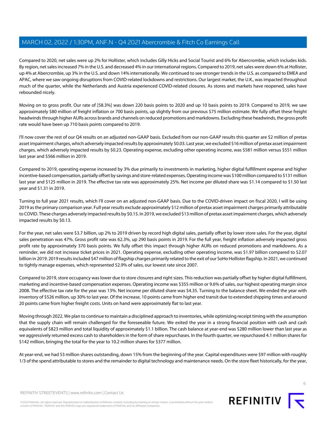 Compared to 2020, net sales were up 2% for Hollister, which includes Gilly Hicks and Social Tourist and 6% for Abercrombie, which includes kids. By region, net sales increased 7% in the U.S. and decreased 4% in our international regions. Compared to 2019, net sales were down 6% at Hollister, up 4% at Abercrombie, up 3% in the U.S. and down 14% internationally. We continued to see stronger trends in the U.S. as compared to EMEA and APAC, where we saw ongoing disruptions from COVID-related lockdowns and restrictions. Our largest market, the U.K., was impacted throughout much of the quarter, while the Netherlands and Austria experienced COVID-related closures. As stores and markets have reopened, sales have rebounded nicely. Moving on to gross profit. Our rate of [58.3%] was down 220 basis points to 2020 and up 10 basis points to 2019. Compared to 2019, we saw approximately $80 million of freight inflation or 700 basis points, up slightly from our previous $75 million estimate. We fully offset these freight headwinds through higher AURs across brands and channels on reduced promotions and markdowns. Excluding these headwinds, the gross profit rate would have been up 710 basis points compared to 2019. I'll now cover the rest of our Q4 results on an adjusted non-GAAP basis. Excluded from our non-GAAP results this quarter are $2 million of pretax asset impairment charges, which adversely impacted results by approximately $0.03. Last year, we excluded $16 million of pretax asset impairment charges, which adversely impacted results by $0.23. Operating expense, excluding other operating income, was $581 million versus $551 million last year and $566 million in 2019. Compared to 2019, operating expense increased by 3% due primarily to investments in marketing, higher digital fulfillment expense and higher incentive-based compensation, partially offset by savings and store-related expenses. Operating income was $100 million compared to $131 million last year and $125 million in 2019. The effective tax rate was approximately 25%. Net income per diluted share was $1.14 compared to $1.50 last year and $1.31 in 2019. Turning to full year 2021 results, which I'll cover on an adjusted non-GAAP basis. Due to the COVID-driven impact on fiscal 2020, I will be using 2019 as the primary comparison year. Full year results exclude approximately $12 million of pretax asset impairment charges primarily attributable to COVID. These charges adversely impacted results by $0.15. In 2019, we excluded $13 million of pretax asset impairment charges, which adversely impacted results by $0.13. For the year, net sales were $3.7 billion, up 2% to 2019 driven by record high digital sales, partially offset by lower store sales. For the year, digital sales penetration was 47%. Gross profit rate was 62.3%, up 290 basis points in 2019. For the full year, freight inflation adversely impacted gross profit rate by approximately 370 basis points. We fully offset this impact through higher AURs on reduced promotions and markdowns. As a reminder, we did not increase ticket prices in 2021. Operating expense, excluding other operating income, was $1.97 billion compared to $2.07 billion in 2019. 2019 results included $47 million of flagship charges primarily related to the exit of our SoHo Hollister flagship. In 2021, we continued to tightly manage expenses, which represented 52.9% of sales, our lowest rate since 2007. Compared to 2019, store occupancy was lower due to store closures and right sizes. This reduction was partially offset by higher digital fulfillment, marketing and incentive-based compensation expenses. Operating income was $355 million or 9.6% of sales, our highest operating margin since 2008. The effective tax rate for the year was 13%. Net income per diluted share was $4.35. Turning to the balance sheet. We ended the year with inventory of $526 million, up 30% to last year. Of the increase, 10 points came from higher end transit due to extended shipping times and around 20 points came from higher freight costs. Units on hand were approximately flat to last year. Moving through 2022. We plan to continue to maintain a disciplined approach to inventories, while optimizing receipt timing with the assumption that the supply chain will remain challenged for the foreseeable future. We exited the year in a strong financial position with cash and cash equivalents of $823 million and total liquidity of approximately $1.1 billion. The cash balance at year-end was $280 million lower than last year as we aggressively returned excess cash to shareholders in the form of share repurchases. In the fourth quarter, we repurchased 4.1 million shares for $142 million, bringing the total for the year to 10.2 million shares for $377 million. At year-end, we had 53 million shares outstanding, down 15% from the beginning of the year. Capital expenditures were $97 million with roughly 1/3 of the spend attributable to stores and the remainder to digital technology and maintenance needs. On the store fleet historically, for the year, 6 REFINITIV STREETEVENTS | www.refinitiv.com | Contact Us ©2022 Refinitiv. All rights reserved. Republication or redistribution of Refinitiv content, including by framing or similar means, is prohibited without the prior written consent of Refinitiv. 'Refinitiv' and the Refinitiv logo are registered trademarks of Refinitiv and its affiliated companies. MARCH 02, 2022 / 1:30PM, ANF.N - Q4 2021 Abercrombie & Fitch Co Earnings Call