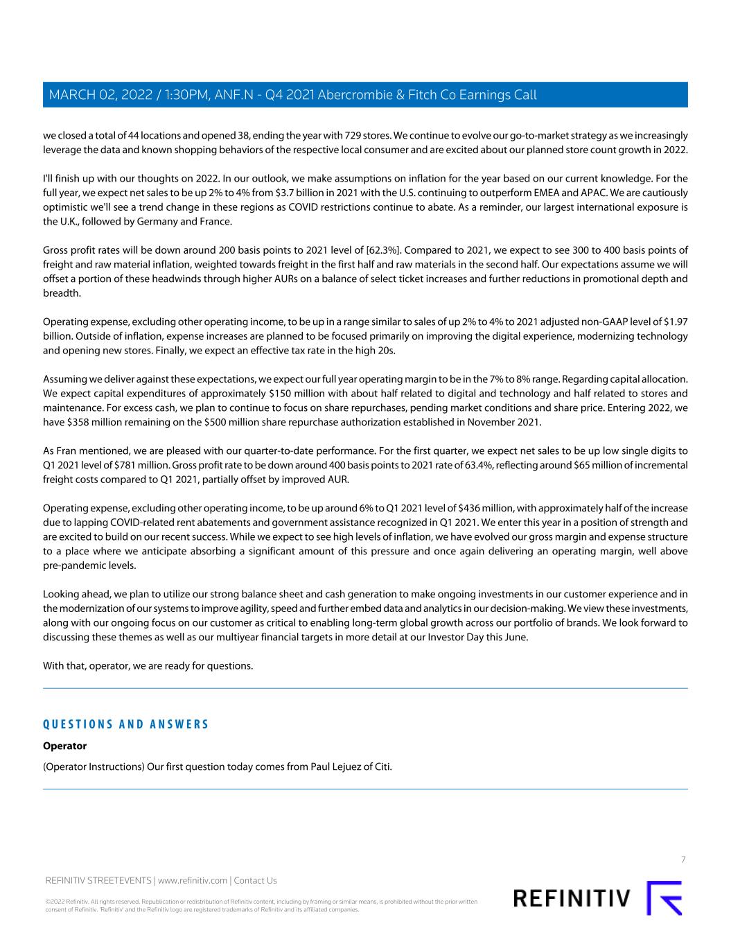 we closed a total of 44 locations and opened 38, ending the year with 729 stores. We continue to evolve our go-to-market strategy as we increasingly leverage the data and known shopping behaviors of the respective local consumer and are excited about our planned store count growth in 2022. I'll finish up with our thoughts on 2022. In our outlook, we make assumptions on inflation for the year based on our current knowledge. For the full year, we expect net sales to be up 2% to 4% from $3.7 billion in 2021 with the U.S. continuing to outperform EMEA and APAC. We are cautiously optimistic we'll see a trend change in these regions as COVID restrictions continue to abate. As a reminder, our largest international exposure is the U.K., followed by Germany and France. Gross profit rates will be down around 200 basis points to 2021 level of [62.3%]. Compared to 2021, we expect to see 300 to 400 basis points of freight and raw material inflation, weighted towards freight in the first half and raw materials in the second half. Our expectations assume we will offset a portion of these headwinds through higher AURs on a balance of select ticket increases and further reductions in promotional depth and breadth. Operating expense, excluding other operating income, to be up in a range similar to sales of up 2% to 4% to 2021 adjusted non-GAAP level of $1.97 billion. Outside of inflation, expense increases are planned to be focused primarily on improving the digital experience, modernizing technology and opening new stores. Finally, we expect an effective tax rate in the high 20s. Assuming we deliver against these expectations, we expect our full year operating margin to be in the 7% to 8% range. Regarding capital allocation. We expect capital expenditures of approximately $150 million with about half related to digital and technology and half related to stores and maintenance. For excess cash, we plan to continue to focus on share repurchases, pending market conditions and share price. Entering 2022, we have $358 million remaining on the $500 million share repurchase authorization established in November 2021. As Fran mentioned, we are pleased with our quarter-to-date performance. For the first quarter, we expect net sales to be up low single digits to Q1 2021 level of $781 million. Gross profit rate to be down around 400 basis points to 2021 rate of 63.4%, reflecting around $65 million of incremental freight costs compared to Q1 2021, partially offset by improved AUR. Operating expense, excluding other operating income, to be up around 6% to Q1 2021 level of $436 million, with approximately half of the increase due to lapping COVID-related rent abatements and government assistance recognized in Q1 2021. We enter this year in a position of strength and are excited to build on our recent success. While we expect to see high levels of inflation, we have evolved our gross margin and expense structure to a place where we anticipate absorbing a significant amount of this pressure and once again delivering an operating margin, well above pre-pandemic levels. Looking ahead, we plan to utilize our strong balance sheet and cash generation to make ongoing investments in our customer experience and in the modernization of our systems to improve agility, speed and further embed data and analytics in our decision-making. We view these investments, along with our ongoing focus on our customer as critical to enabling long-term global growth across our portfolio of brands. We look forward to discussing these themes as well as our multiyear financial targets in more detail at our Investor Day this June. With that, operator, we are ready for questions. Q U E S T I O N S A N D A N S W E R S Operator (Operator Instructions) Our first question today comes from Paul Lejuez of Citi. 7 REFINITIV STREETEVENTS | www.refinitiv.com | Contact Us ©2022 Refinitiv. All rights reserved. Republication or redistribution of Refinitiv content, including by framing or similar means, is prohibited without the prior written consent of Refinitiv. 'Refinitiv' and the Refinitiv logo are registered trademarks of Refinitiv and its affiliated companies. MARCH 02, 2022 / 1:30PM, ANF.N - Q4 2021 Abercrombie & Fitch Co Earnings Call