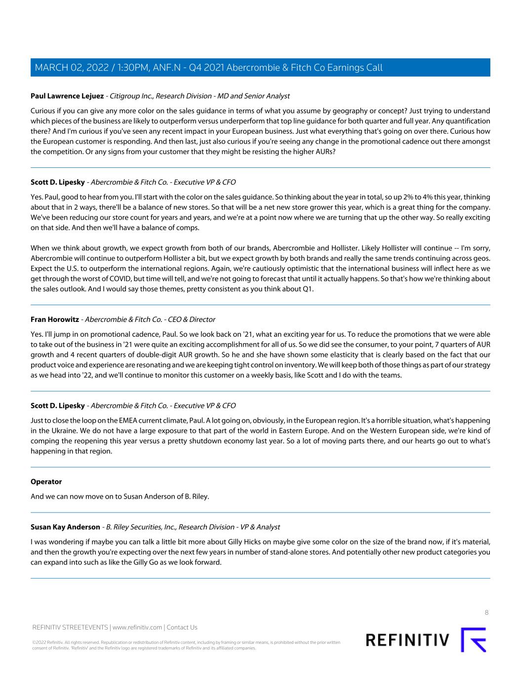 Paul Lawrence Lejuez - Citigroup Inc., Research Division - MD and Senior Analyst Curious if you can give any more color on the sales guidance in terms of what you assume by geography or concept? Just trying to understand which pieces of the business are likely to outperform versus underperform that top line guidance for both quarter and full year. Any quantification there? And I'm curious if you've seen any recent impact in your European business. Just what everything that's going on over there. Curious how the European customer is responding. And then last, just also curious if you're seeing any change in the promotional cadence out there amongst the competition. Or any signs from your customer that they might be resisting the higher AURs? Scott D. Lipesky - Abercrombie & Fitch Co. - Executive VP & CFO Yes. Paul, good to hear from you. I'll start with the color on the sales guidance. So thinking about the year in total, so up 2% to 4% this year, thinking about that in 2 ways, there'll be a balance of new stores. So that will be a net new store grower this year, which is a great thing for the company. We've been reducing our store count for years and years, and we're at a point now where we are turning that up the other way. So really exciting on that side. And then we'll have a balance of comps. When we think about growth, we expect growth from both of our brands, Abercrombie and Hollister. Likely Hollister will continue -- I'm sorry, Abercrombie will continue to outperform Hollister a bit, but we expect growth by both brands and really the same trends continuing across geos. Expect the U.S. to outperform the international regions. Again, we're cautiously optimistic that the international business will inflect here as we get through the worst of COVID, but time will tell, and we're not going to forecast that until it actually happens. So that's how we're thinking about the sales outlook. And I would say those themes, pretty consistent as you think about Q1. Fran Horowitz - Abercrombie & Fitch Co. - CEO & Director Yes. I'll jump in on promotional cadence, Paul. So we look back on '21, what an exciting year for us. To reduce the promotions that we were able to take out of the business in '21 were quite an exciting accomplishment for all of us. So we did see the consumer, to your point, 7 quarters of AUR growth and 4 recent quarters of double-digit AUR growth. So he and she have shown some elasticity that is clearly based on the fact that our product voice and experience are resonating and we are keeping tight control on inventory. We will keep both of those things as part of our strategy as we head into '22, and we'll continue to monitor this customer on a weekly basis, like Scott and I do with the teams. Scott D. Lipesky - Abercrombie & Fitch Co. - Executive VP & CFO Just to close the loop on the EMEA current climate, Paul. A lot going on, obviously, in the European region. It's a horrible situation, what's happening in the Ukraine. We do not have a large exposure to that part of the world in Eastern Europe. And on the Western European side, we're kind of comping the reopening this year versus a pretty shutdown economy last year. So a lot of moving parts there, and our hearts go out to what's happening in that region. Operator And we can now move on to Susan Anderson of B. Riley. Susan Kay Anderson - B. Riley Securities, Inc., Research Division - VP & Analyst I was wondering if maybe you can talk a little bit more about Gilly Hicks on maybe give some color on the size of the brand now, if it's material, and then the growth you're expecting over the next few years in number of stand-alone stores. And potentially other new product categories you can expand into such as like the Gilly Go as we look forward. 8 REFINITIV STREETEVENTS | www.refinitiv.com | Contact Us ©2022 Refinitiv. All rights reserved. Republication or redistribution of Refinitiv content, including by framing or similar means, is prohibited without the prior written consent of Refinitiv. 'Refinitiv' and the Refinitiv logo are registered trademarks of Refinitiv and its affiliated companies. MARCH 02, 2022 / 1:30PM, ANF.N - Q4 2021 Abercrombie & Fitch Co Earnings Call