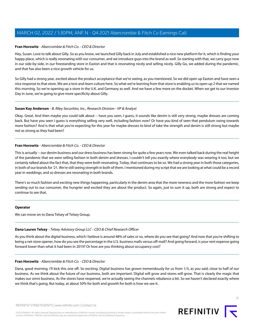 Fran Horowitz - Abercrombie & Fitch Co. - CEO & Director Hey, Susan. Love to talk about Gilly. So as you know, we launched Gilly back in July and established a nice new platform for it, which is finding your happy place, which is really resonating with our consumer, and we introduce guys into the brand as well. So starting with that, we carry guys now in our side-by-side, in our freestanding store in Easton and that is resonating nicely and selling nicely. Gilly Go, we added during the pandemic, and that has also been a nice growth vehicle for us. So Gilly had a strong year, excited about the product acceptance that we're seeing, as you mentioned. So we did open up Easton and have seen a nice response to that store. We are a test-and-learn culture here. So what we're learning from that store is enabling us to open up 2 that we named this morning. So we're opening up a store in the U.K. and Germany as well. And we have a few more on the docket. When we get to our Investor Day in June, we're going to give more specificity about Gilly. Susan Kay Anderson - B. Riley Securities, Inc., Research Division - VP & Analyst Okay. Great. And then maybe you could talk about -- have you seen, I guess, it sounds like denim is still very strong, maybe dresses are coming back. But have you seen I guess is everything selling very well, including fashion now? Or have you kind of seen that pendulum swing towards more fashion? And is that what you're expecting for this year for maybe dresses to kind of take the strength and denim is still strong but maybe not as strong as they had been? Fran Horowitz - Abercrombie & Fitch Co. - CEO & Director This is actually -- our denim business and our dress business has been strong for quite a few years now. We even talked back during the real height of the pandemic that we were selling fashion in both denim and dresses. I couldn't tell you exactly where everybody was wearing it too, but we certainly talked about the fact that, that they were both resonating. Today, that continues to be so. We had a strong year in both those categories, in both of our brands for '21. We're still seeing strength in both of them. I mentioned during my script that we are looking at what could be a record year in weddings, and so dresses are resonating in both brands. There's so much fashion and exciting new things happening, particularly in the denim area that the more newness and the more fashion we keep sending out to our consumer, the hungrier and excited they are about the product. So again, just to sum it up, both are strong and expect to continue to see that. Operator We can move on to Dana Telsey of Telsey Group. Dana Lauren Telsey - Telsey Advisory Group LLC - CEO & Chief Research Officer As you think about the digital business, which I believe is around 48% of sales or so, where do you see that going? And now that you're shifting to being a net store opener, how do you see the percentage in the U.S. business malls versus off-mall? And going forward, is your rent expense going forward lower than what it had been in 2019? Or how are you thinking about occupancy cost? Fran Horowitz - Abercrombie & Fitch Co. - CEO & Director Dana, good morning. I'll kick this one off. So exciting. Digital business has grown tremendously for us from 1/3, as you said, close to half of our business. As we think about the future of our business, both are important. Digital will grow and stores will grow. That is clearly the magic that makes our omni business. As the stores have reopened, we're actually seeing the channels rebalance a bit. So we haven't declared exactly where we think that's going. But today, at about 50% for both and growth for both is how we see it. 9 REFINITIV STREETEVENTS | www.refinitiv.com | Contact Us ©2022 Refinitiv. All rights reserved. Republication or redistribution of Refinitiv content, including by framing or similar means, is prohibited without the prior written consent of Refinitiv. 'Refinitiv' and the Refinitiv logo are registered trademarks of Refinitiv and its affiliated companies. MARCH 02, 2022 / 1:30PM, ANF.N - Q4 2021 Abercrombie & Fitch Co Earnings Call