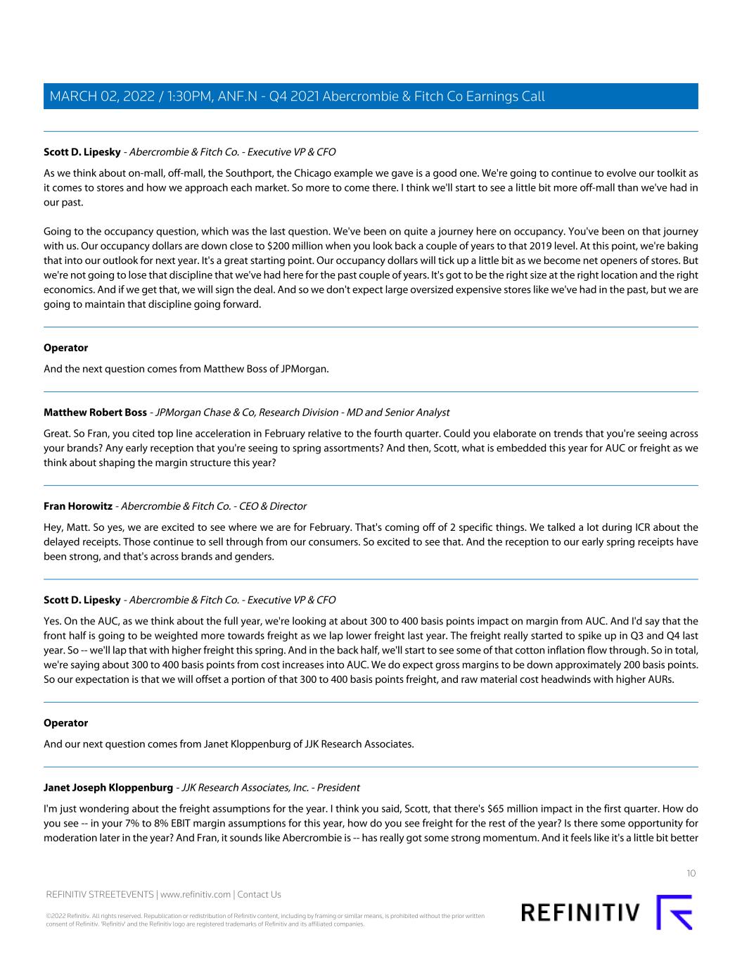 Scott D. Lipesky - Abercrombie & Fitch Co. - Executive VP & CFO As we think about on-mall, off-mall, the Southport, the Chicago example we gave is a good one. We're going to continue to evolve our toolkit as it comes to stores and how we approach each market. So more to come there. I think we'll start to see a little bit more off-mall than we've had in our past. Going to the occupancy question, which was the last question. We've been on quite a journey here on occupancy. You've been on that journey with us. Our occupancy dollars are down close to $200 million when you look back a couple of years to that 2019 level. At this point, we're baking that into our outlook for next year. It's a great starting point. Our occupancy dollars will tick up a little bit as we become net openers of stores. But we're not going to lose that discipline that we've had here for the past couple of years. It's got to be the right size at the right location and the right economics. And if we get that, we will sign the deal. And so we don't expect large oversized expensive stores like we've had in the past, but we are going to maintain that discipline going forward. Operator And the next question comes from Matthew Boss of JPMorgan. Matthew Robert Boss - JPMorgan Chase & Co, Research Division - MD and Senior Analyst Great. So Fran, you cited top line acceleration in February relative to the fourth quarter. Could you elaborate on trends that you're seeing across your brands? Any early reception that you're seeing to spring assortments? And then, Scott, what is embedded this year for AUC or freight as we think about shaping the margin structure this year? Fran Horowitz - Abercrombie & Fitch Co. - CEO & Director Hey, Matt. So yes, we are excited to see where we are for February. That's coming off of 2 specific things. We talked a lot during ICR about the delayed receipts. Those continue to sell through from our consumers. So excited to see that. And the reception to our early spring receipts have been strong, and that's across brands and genders. Scott D. Lipesky - Abercrombie & Fitch Co. - Executive VP & CFO Yes. On the AUC, as we think about the full year, we're looking at about 300 to 400 basis points impact on margin from AUC. And I'd say that the front half is going to be weighted more towards freight as we lap lower freight last year. The freight really started to spike up in Q3 and Q4 last year. So -- we'll lap that with higher freight this spring. And in the back half, we'll start to see some of that cotton inflation flow through. So in total, we're saying about 300 to 400 basis points from cost increases into AUC. We do expect gross margins to be down approximately 200 basis points. So our expectation is that we will offset a portion of that 300 to 400 basis points freight, and raw material cost headwinds with higher AURs. Operator And our next question comes from Janet Kloppenburg of JJK Research Associates. Janet Joseph Kloppenburg - JJK Research Associates, Inc. - President I'm just wondering about the freight assumptions for the year. I think you said, Scott, that there's $65 million impact in the first quarter. How do you see -- in your 7% to 8% EBIT margin assumptions for this year, how do you see freight for the rest of the year? Is there some opportunity for moderation later in the year? And Fran, it sounds like Abercrombie is -- has really got some strong momentum. And it feels like it's a little bit better 10 REFINITIV STREETEVENTS | www.refinitiv.com | Contact Us ©2022 Refinitiv. All rights reserved. Republication or redistribution of Refinitiv content, including by framing or similar means, is prohibited without the prior written consent of Refinitiv. 'Refinitiv' and the Refinitiv logo are registered trademarks of Refinitiv and its affiliated companies. MARCH 02, 2022 / 1:30PM, ANF.N - Q4 2021 Abercrombie & Fitch Co Earnings Call