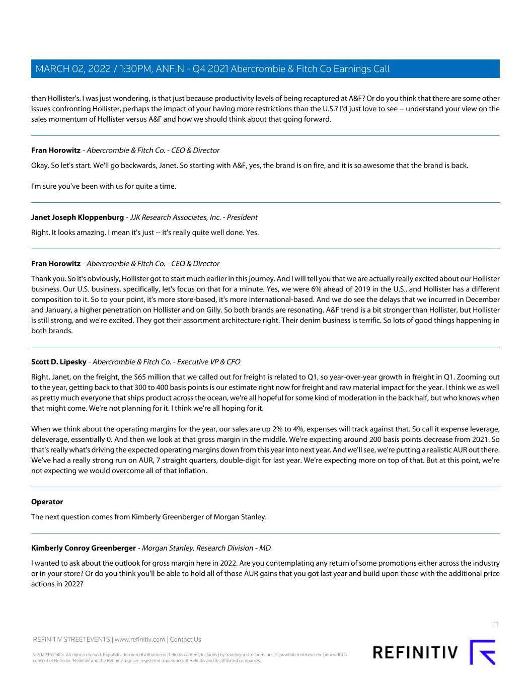 than Hollister's. I was just wondering, is that just because productivity levels of being recaptured at A&F? Or do you think that there are some other issues confronting Hollister, perhaps the impact of your having more restrictions than the U.S.? I'd just love to see -- understand your view on the sales momentum of Hollister versus A&F and how we should think about that going forward. Fran Horowitz - Abercrombie & Fitch Co. - CEO & Director Okay. So let's start. We'll go backwards, Janet. So starting with A&F, yes, the brand is on fire, and it is so awesome that the brand is back. I'm sure you've been with us for quite a time. Janet Joseph Kloppenburg - JJK Research Associates, Inc. - President Right. It looks amazing. I mean it's just -- it's really quite well done. Yes. Fran Horowitz - Abercrombie & Fitch Co. - CEO & Director Thank you. So it's obviously, Hollister got to start much earlier in this journey. And I will tell you that we are actually really excited about our Hollister business. Our U.S. business, specifically, let's focus on that for a minute. Yes, we were 6% ahead of 2019 in the U.S., and Hollister has a different composition to it. So to your point, it's more store-based, it's more international-based. And we do see the delays that we incurred in December and January, a higher penetration on Hollister and on Gilly. So both brands are resonating. A&F trend is a bit stronger than Hollister, but Hollister is still strong, and we're excited. They got their assortment architecture right. Their denim business is terrific. So lots of good things happening in both brands. Scott D. Lipesky - Abercrombie & Fitch Co. - Executive VP & CFO Right, Janet, on the freight, the $65 million that we called out for freight is related to Q1, so year-over-year growth in freight in Q1. Zooming out to the year, getting back to that 300 to 400 basis points is our estimate right now for freight and raw material impact for the year. I think we as well as pretty much everyone that ships product across the ocean, we're all hopeful for some kind of moderation in the back half, but who knows when that might come. We're not planning for it. I think we're all hoping for it. When we think about the operating margins for the year, our sales are up 2% to 4%, expenses will track against that. So call it expense leverage, deleverage, essentially 0. And then we look at that gross margin in the middle. We're expecting around 200 basis points decrease from 2021. So that's really what's driving the expected operating margins down from this year into next year. And we'll see, we're putting a realistic AUR out there. We've had a really strong run on AUR, 7 straight quarters, double-digit for last year. We're expecting more on top of that. But at this point, we're not expecting we would overcome all of that inflation. Operator The next question comes from Kimberly Greenberger of Morgan Stanley. Kimberly Conroy Greenberger - Morgan Stanley, Research Division - MD I wanted to ask about the outlook for gross margin here in 2022. Are you contemplating any return of some promotions either across the industry or in your store? Or do you think you'll be able to hold all of those AUR gains that you got last year and build upon those with the additional price actions in 2022? 11 REFINITIV STREETEVENTS | www.refinitiv.com | Contact Us ©2022 Refinitiv. All rights reserved. Republication or redistribution of Refinitiv content, including by framing or similar means, is prohibited without the prior written consent of Refinitiv. 'Refinitiv' and the Refinitiv logo are registered trademarks of Refinitiv and its affiliated companies. MARCH 02, 2022 / 1:30PM, ANF.N - Q4 2021 Abercrombie & Fitch Co Earnings Call