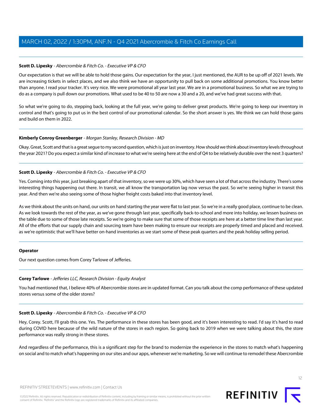 Scott D. Lipesky - Abercrombie & Fitch Co. - Executive VP & CFO Our expectation is that we will be able to hold those gains. Our expectation for the year, I just mentioned, the AUR to be up off of 2021 levels. We are increasing tickets in select places, and we also think we have an opportunity to pull back on some additional promotions. You know better than anyone. I read your tracker. It's very nice. We were promotional all year last year. We are in a promotional business. So what we are trying to do as a company is pull down our promotions. What used to be 40 to 50 are now a 30 and a 20, and we've had great success with that. So what we're going to do, stepping back, looking at the full year, we're going to deliver great products. We're going to keep our inventory in control and that's going to put us in the best control of our promotional calendar. So the short answer is yes. We think we can hold those gains and build on them in 2022. Kimberly Conroy Greenberger - Morgan Stanley, Research Division - MD Okay. Great, Scott and that is a great segue to my second question, which is just on inventory. How should we think about inventory levels throughout the year 2021? Do you expect a similar kind of increase to what we're seeing here at the end of Q4 to be relatively durable over the next 3 quarters? Scott D. Lipesky - Abercrombie & Fitch Co. - Executive VP & CFO Yes. Coming into this year, just breaking apart of that inventory, so we were up 30%, which have seen a lot of that across the industry. There's some interesting things happening out there. In transit, we all know the transportation lag now versus the past. So we're seeing higher in transit this year. And then we're also seeing some of those higher freight costs baked into that inventory level. As we think about the units on hand, our units on hand starting the year were flat to last year. So we're in a really good place, continue to be clean. As we look towards the rest of the year, as we've gone through last year, specifically back-to-school and more into holiday, we lessen business on the table due to some of those late receipts. So we're going to make sure that some of those receipts are here at a better time line than last year. All of the efforts that our supply chain and sourcing team have been making to ensure our receipts are properly timed and placed and received. as we're optimistic that we'll have better on-hand inventories as we start some of these peak quarters and the peak holiday selling period. Operator Our next question comes from Corey Tarlowe of Jefferies. Corey Tarlowe - Jefferies LLC, Research Division - Equity Analyst You had mentioned that, I believe 40% of Abercrombie stores are in updated format. Can you talk about the comp performance of these updated stores versus some of the older stores? Scott D. Lipesky - Abercrombie & Fitch Co. - Executive VP & CFO Hey, Corey. Scott, I'll grab this one. Yes. The performance in these stores has been good, and it's been interesting to read. I'd say it's hard to read during COVID here because of the wild nature of the stores in each region. So going back to 2019 when we were talking about this, the store performance was really strong in these stores. And regardless of the performance, this is a significant step for the brand to modernize the experience in the stores to match what's happening on social and to match what's happening on our sites and our apps, whenever we're marketing. So we will continue to remodel these Abercrombie 12 REFINITIV STREETEVENTS | www.refinitiv.com | Contact Us ©2022 Refinitiv. All rights reserved. Republication or redistribution of Refinitiv content, including by framing or similar means, is prohibited without the prior written consent of Refinitiv. 'Refinitiv' and the Refinitiv logo are registered trademarks of Refinitiv and its affiliated companies. MARCH 02, 2022 / 1:30PM, ANF.N - Q4 2021 Abercrombie & Fitch Co Earnings Call