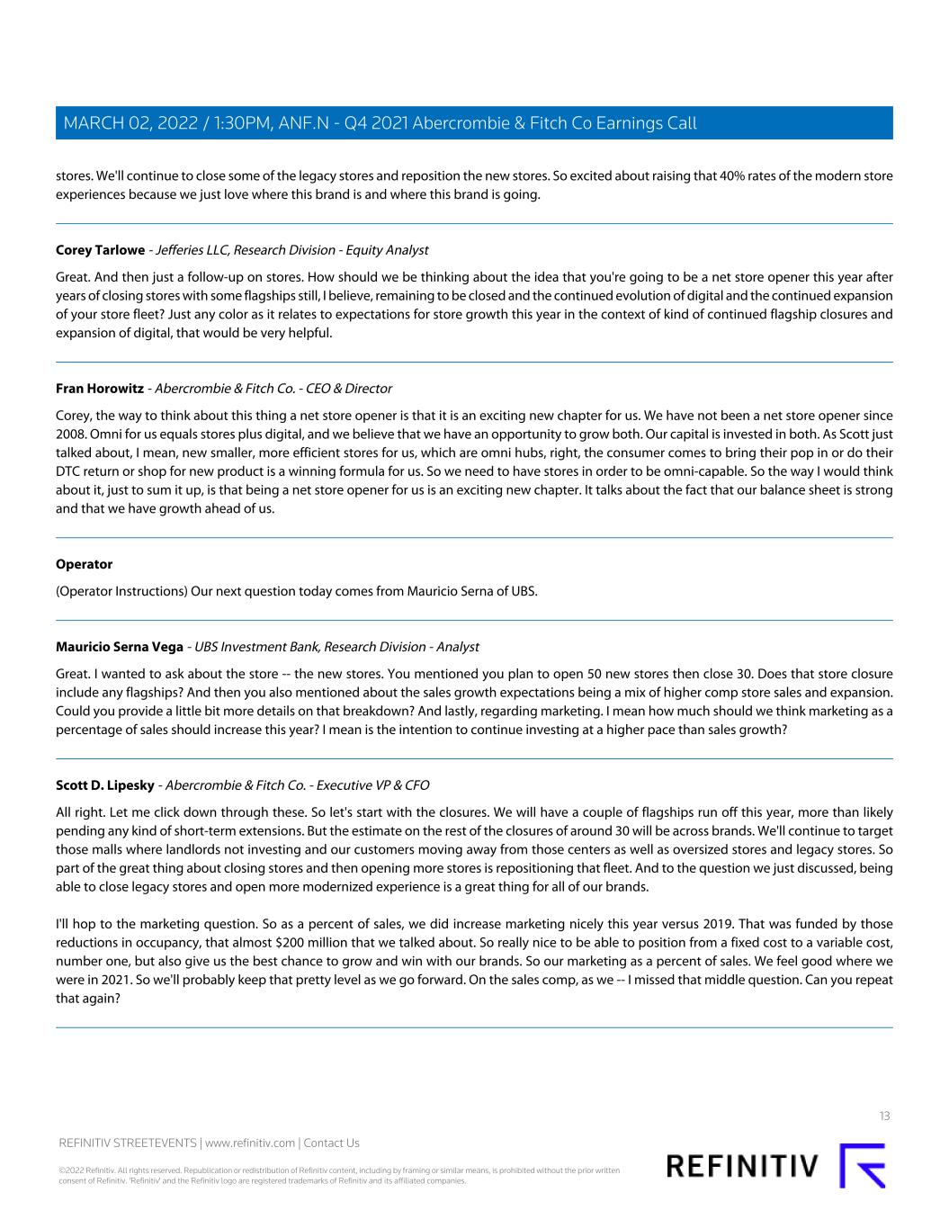 stores. We'll continue to close some of the legacy stores and reposition the new stores. So excited about raising that 40% rates of the modern store experiences because we just love where this brand is and where this brand is going. Corey Tarlowe - Jefferies LLC, Research Division - Equity Analyst Great. And then just a follow-up on stores. How should we be thinking about the idea that you're going to be a net store opener this year after years of closing stores with some flagships still, I believe, remaining to be closed and the continued evolution of digital and the continued expansion of your store fleet? Just any color as it relates to expectations for store growth this year in the context of kind of continued flagship closures and expansion of digital, that would be very helpful. Fran Horowitz - Abercrombie & Fitch Co. - CEO & Director Corey, the way to think about this thing a net store opener is that it is an exciting new chapter for us. We have not been a net store opener since 2008. Omni for us equals stores plus digital, and we believe that we have an opportunity to grow both. Our capital is invested in both. As Scott just talked about, I mean, new smaller, more efficient stores for us, which are omni hubs, right, the consumer comes to bring their pop in or do their DTC return or shop for new product is a winning formula for us. So we need to have stores in order to be omni-capable. So the way I would think about it, just to sum it up, is that being a net store opener for us is an exciting new chapter. It talks about the fact that our balance sheet is strong and that we have growth ahead of us. Operator (Operator Instructions) Our next question today comes from Mauricio Serna of UBS. Mauricio Serna Vega - UBS Investment Bank, Research Division - Analyst Great. I wanted to ask about the store -- the new stores. You mentioned you plan to open 50 new stores then close 30. Does that store closure include any flagships? And then you also mentioned about the sales growth expectations being a mix of higher comp store sales and expansion. Could you provide a little bit more details on that breakdown? And lastly, regarding marketing. I mean how much should we think marketing as a percentage of sales should increase this year? I mean is the intention to continue investing at a higher pace than sales growth? Scott D. Lipesky - Abercrombie & Fitch Co. - Executive VP & CFO All right. Let me click down through these. So let's start with the closures. We will have a couple of flagships run off this year, more than likely pending any kind of short-term extensions. But the estimate on the rest of the closures of around 30 will be across brands. We'll continue to target those malls where landlords not investing and our customers moving away from those centers as well as oversized stores and legacy stores. So part of the great thing about closing stores and then opening more stores is repositioning that fleet. And to the question we just discussed, being able to close legacy stores and open more modernized experience is a great thing for all of our brands. I'll hop to the marketing question. So as a percent of sales, we did increase marketing nicely this year versus 2019. That was funded by those reductions in occupancy, that almost $200 million that we talked about. So really nice to be able to position from a fixed cost to a variable cost, number one, but also give us the best chance to grow and win with our brands. So our marketing as a percent of sales. We feel good where we were in 2021. So we'll probably keep that pretty level as we go forward. On the sales comp, as we -- I missed that middle question. Can you repeat that again? 13 REFINITIV STREETEVENTS | www.refinitiv.com | Contact Us ©2022 Refinitiv. All rights reserved. Republication or redistribution of Refinitiv content, including by framing or similar means, is prohibited without the prior written consent of Refinitiv. 'Refinitiv' and the Refinitiv logo are registered trademarks of Refinitiv and its affiliated companies. MARCH 02, 2022 / 1:30PM, ANF.N - Q4 2021 Abercrombie & Fitch Co Earnings Call