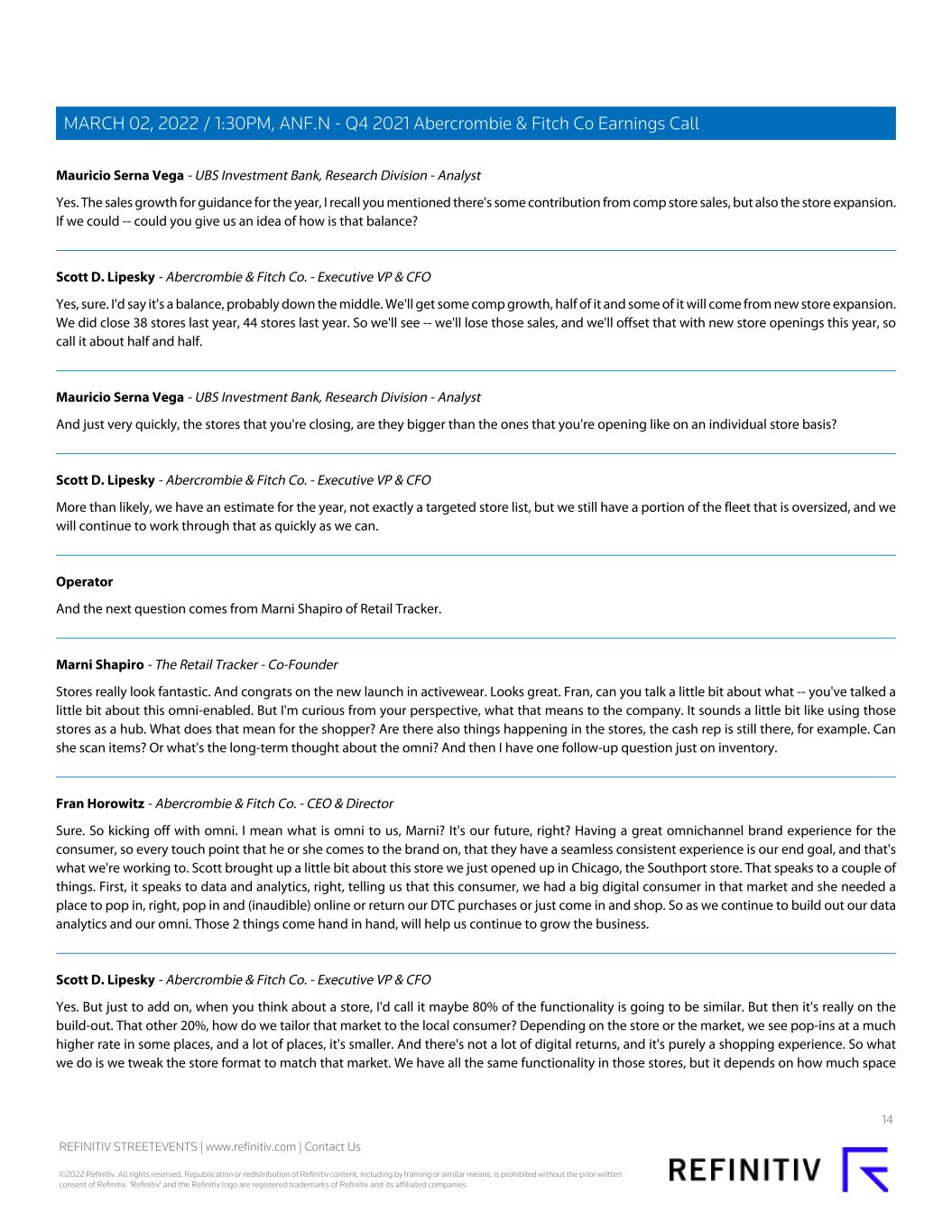 Mauricio Serna Vega - UBS Investment Bank, Research Division - Analyst Yes. The sales growth for guidance for the year, I recall you mentioned there's some contribution from comp store sales, but also the store expansion. If we could -- could you give us an idea of how is that balance? Scott D. Lipesky - Abercrombie & Fitch Co. - Executive VP & CFO Yes, sure. I'd say it's a balance, probably down the middle. We'll get some comp growth, half of it and some of it will come from new store expansion. We did close 38 stores last year, 44 stores last year. So we'll see -- we'll lose those sales, and we'll offset that with new store openings this year, so call it about half and half. Mauricio Serna Vega - UBS Investment Bank, Research Division - Analyst And just very quickly, the stores that you're closing, are they bigger than the ones that you're opening like on an individual store basis? Scott D. Lipesky - Abercrombie & Fitch Co. - Executive VP & CFO More than likely, we have an estimate for the year, not exactly a targeted store list, but we still have a portion of the fleet that is oversized, and we will continue to work through that as quickly as we can. Operator And the next question comes from Marni Shapiro of Retail Tracker. Marni Shapiro - The Retail Tracker - Co-Founder Stores really look fantastic. And congrats on the new launch in activewear. Looks great. Fran, can you talk a little bit about what -- you've talked a little bit about this omni-enabled. But I'm curious from your perspective, what that means to the company. It sounds a little bit like using those stores as a hub. What does that mean for the shopper? Are there also things happening in the stores, the cash rep is still there, for example. Can she scan items? Or what's the long-term thought about the omni? And then I have one follow-up question just on inventory. Fran Horowitz - Abercrombie & Fitch Co. - CEO & Director Sure. So kicking off with omni. I mean what is omni to us, Marni? It's our future, right? Having a great omnichannel brand experience for the consumer, so every touch point that he or she comes to the brand on, that they have a seamless consistent experience is our end goal, and that's what we're working to. Scott brought up a little bit about this store we just opened up in Chicago, the Southport store. That speaks to a couple of things. First, it speaks to data and analytics, right, telling us that this consumer, we had a big digital consumer in that market and she needed a place to pop in, right, pop in and (inaudible) online or return our DTC purchases or just come in and shop. So as we continue to build out our data analytics and our omni. Those 2 things come hand in hand, will help us continue to grow the business. Scott D. Lipesky - Abercrombie & Fitch Co. - Executive VP & CFO Yes. But just to add on, when you think about a store, I'd call it maybe 80% of the functionality is going to be similar. But then it's really on the build-out. That other 20%, how do we tailor that market to the local consumer? Depending on the store or the market, we see pop-ins at a much higher rate in some places, and a lot of places, it's smaller. And there's not a lot of digital returns, and it's purely a shopping experience. So what we do is we tweak the store format to match that market. We have all the same functionality in those stores, but it depends on how much space 14 REFINITIV STREETEVENTS | www.refinitiv.com | Contact Us ©2022 Refinitiv. All rights reserved. Republication or redistribution of Refinitiv content, including by framing or similar means, is prohibited without the prior written consent of Refinitiv. 'Refinitiv' and the Refinitiv logo are registered trademarks of Refinitiv and its affiliated companies. MARCH 02, 2022 / 1:30PM, ANF.N - Q4 2021 Abercrombie & Fitch Co Earnings Call