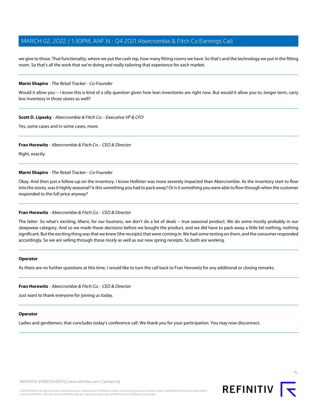 we give to those. That functionality, where we put the cash rep, how many fitting rooms we have. So that's and the technology we put in the fitting room. So that's all the work that we're doing and really tailoring that experience for each market. Marni Shapiro - The Retail Tracker - Co-Founder Would it allow you -- I know this is kind of a silly question given how lean inventories are right now. But would it allow you to, longer term, carry less inventory in those stores as well? Scott D. Lipesky - Abercrombie & Fitch Co. - Executive VP & CFO Yes, some cases and in some cases, more. Fran Horowitz - Abercrombie & Fitch Co. - CEO & Director Right, exactly. Marni Shapiro - The Retail Tracker - Co-Founder Okay. And then just a follow-up on the inventory. I know Hollister was more severely impacted than Abercrombie. As the inventory start to flow into the stores, was it highly seasonal? Is this something you had to pack away? Or is it something you were able to flow through when the customer responded to the full price anyway? Fran Horowitz - Abercrombie & Fitch Co. - CEO & Director The latter. So what's exciting, Marni, for our business, we don't do a lot of deals -- true seasonal product. We do some mostly probably in our sleepwear category. And so we made those decisions before we bought the product, and we did have to pack away a little bit nothing, nothing significant. But the exciting thing was that we knew [the receipts] that were coming in. We had some testing on them, and the consumer responded accordingly. So we are selling through those nicely as well as our new spring receipts. So both are working. Operator As there are no further questions at this time, I would like to turn the call back to Fran Horowitz for any additional or closing remarks. Fran Horowitz - Abercrombie & Fitch Co. - CEO & Director Just want to thank everyone for joining us today. Operator Ladies and gentlemen, that concludes today's conference call. We thank you for your participation. You may now disconnect. 15 REFINITIV STREETEVENTS | www.refinitiv.com | Contact Us ©2022 Refinitiv. All rights reserved. Republication or redistribution of Refinitiv content, including by framing or similar means, is prohibited without the prior written consent of Refinitiv. 'Refinitiv' and the Refinitiv logo are registered trademarks of Refinitiv and its affiliated companies. MARCH 02, 2022 / 1:30PM, ANF.N - Q4 2021 Abercrombie & Fitch Co Earnings Call