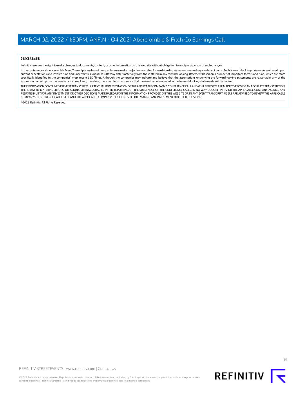 D I S C L A I M E R Refinitiv reserves the right to make changes to documents, content, or other information on this web site without obligation to notify any person of such changes. In the conference calls upon which Event Transcripts are based, companies may make projections or other forward-looking statements regarding a variety of items. Such forward-looking statements are based upon current expectations and involve risks and uncertainties. Actual results may differ materially from those stated in any forward-looking statement based on a number of important factors and risks, which are more specifically identified in the companies' most recent SEC filings. Although the companies may indicate and believe that the assumptions underlying the forward-looking statements are reasonable, any of the assumptions could prove inaccurate or incorrect and, therefore, there can be no assurance that the results contemplated in the forward-looking statements will be realized. THE INFORMATION CONTAINED IN EVENT TRANSCRIPTS IS A TEXTUAL REPRESENTATION OF THE APPLICABLE COMPANY'S CONFERENCE CALL AND WHILE EFFORTS ARE MADE TO PROVIDE AN ACCURATE TRANSCRIPTION, THERE MAY BE MATERIAL ERRORS, OMISSIONS, OR INACCURACIES IN THE REPORTING OF THE SUBSTANCE OF THE CONFERENCE CALLS. IN NO WAY DOES REFINITIV OR THE APPLICABLE COMPANY ASSUME ANY RESPONSIBILITY FOR ANY INVESTMENT OR OTHER DECISIONS MADE BASED UPON THE INFORMATION PROVIDED ON THIS WEB SITE OR IN ANY EVENT TRANSCRIPT. USERS ARE ADVISED TO REVIEW THE APPLICABLE COMPANY'S CONFERENCE CALL ITSELF AND THE APPLICABLE COMPANY'S SEC FILINGS BEFORE MAKING ANY INVESTMENT OR OTHER DECISIONS. ©2022, Refinitiv. All Rights Reserved. 15110173-2022-03-03T00:55:39.597 16 REFINITIV STREETEVENTS | www.refinitiv.com | Contact Us ©2022 Refinitiv. All rights reserved. Republication or redistribution of Refinitiv content, including by framing or similar means, is prohibited without the prior written consent of Refinitiv. 'Refinitiv' and the Refinitiv logo are registered trademarks of Refinitiv and its affiliated companies. MARCH 02, 2022 / 1:30PM, ANF.N - Q4 2021 Abercrombie & Fitch Co Earnings Call
