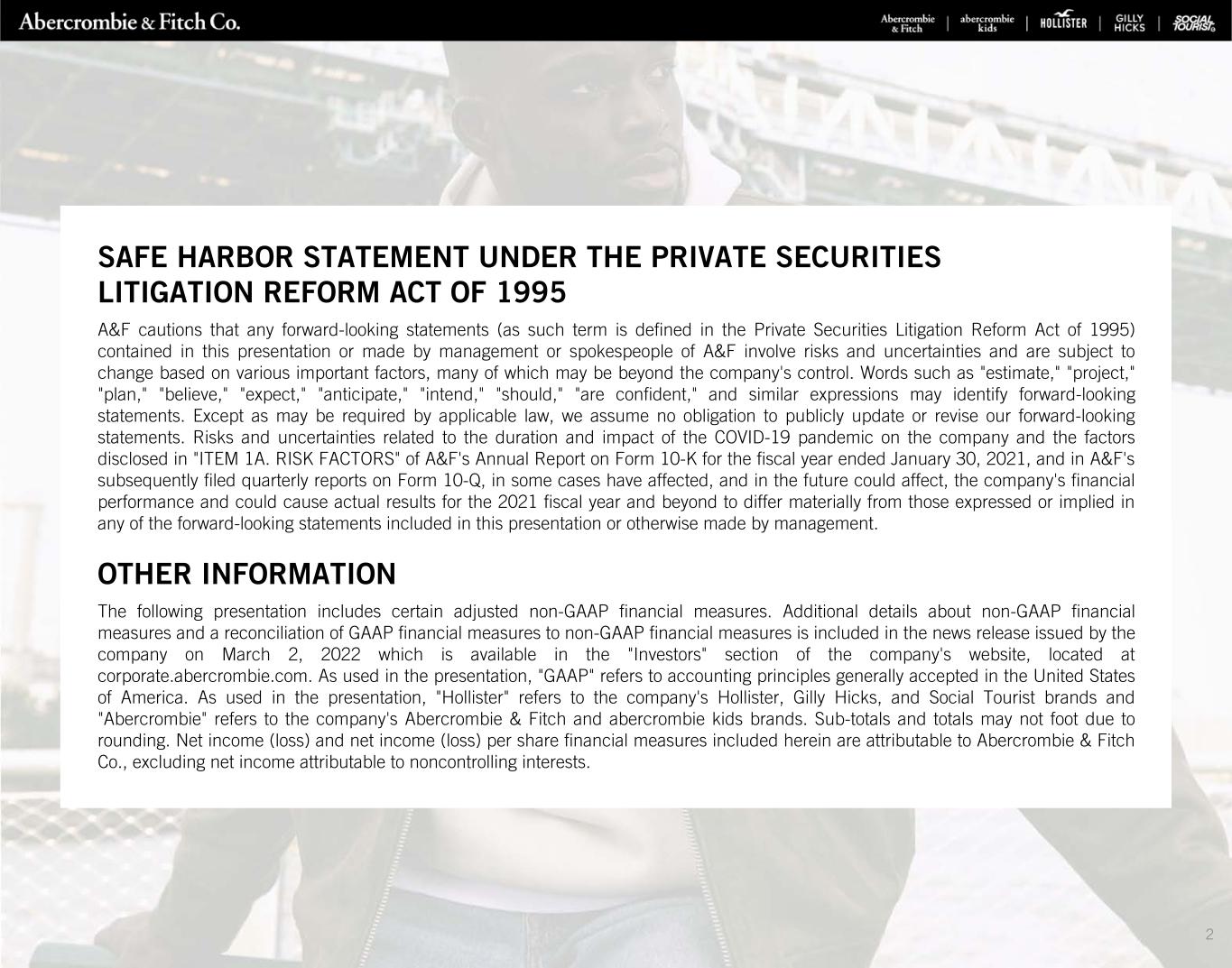 SAFE HARBOR STATEMENT UNDER THE PRIVATE SECURITIES LITIGATION REFORM ACT OF 1995 A&F cautions that any forward-looking statements (as such term is defined in the Private Securities Litigation Reform Act of 1995) contained in this presentation or made by management or spokespeople of A&F involve risks and uncertainties and are subject to change based on various important factors, many of which may be beyond the company's control. Words such as "estimate," "project," "plan," "believe," "expect," "anticipate," "intend," "should," "are confident," and similar expressions may identify forward-looking statements. Except as may be required by applicable law, we assume no obligation to publicly update or revise our forward-looking statements. Risks and uncertainties related to the duration and impact of the COVID-19 pandemic on the company and the factors disclosed in "ITEM 1A. RISK FACTORS" of A&F's Annual Report on Form 10-K for the fiscal year ended January 30, 2021, and in A&F's subsequently filed quarterly reports on Form 10-Q, in some cases have affected, and in the future could affect, the company's financial performance and could cause actual results for the 2021 fiscal year and beyond to differ materially from those expressed or implied in any of the forward-looking statements included in this presentation or otherwise made by management. OTHER INFORMATION The following presentation includes certain adjusted non-GAAP financial measures. Additional details about non-GAAP financial measures and a reconciliation of GAAP financial measures to non-GAAP financial measures is included in the news release issued by the company on March 2, 2022 which is available in the "Investors" section of the company's website, located at corporate.abercrombie.com. As used in the presentation, "GAAP" refers to accounting principles generally accepted in the United States of America. As used in the presentation, "Hollister" refers to the company's Hollister, Gilly Hicks, and Social Tourist brands and "Abercrombie" refers to the company's Abercrombie & Fitch and abercrombie kids brands. Sub-totals and totals may not foot due to rounding. Net income (loss) and net income (loss) per share financial measures included herein are attributable to Abercrombie & Fitch Co., excluding net income attributable to noncontrolling interests. 2