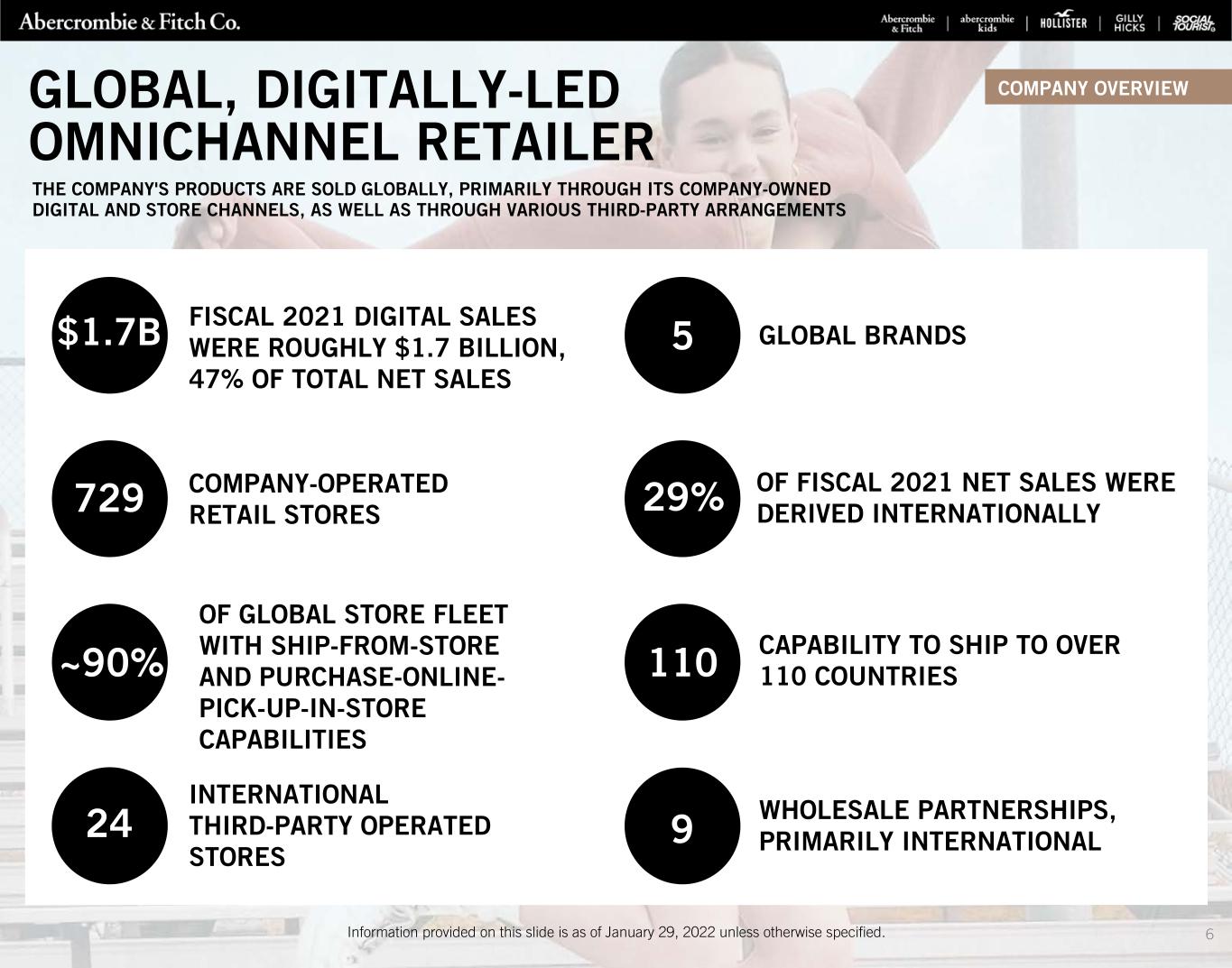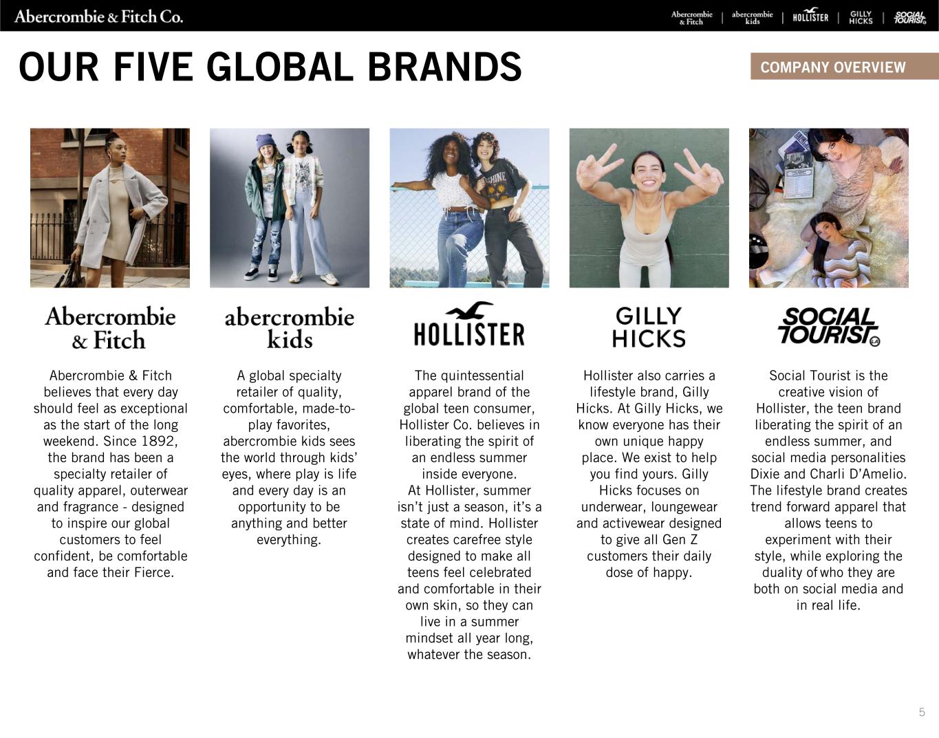 5 COMPANY OVERVIEWOUR FIVE GLOBAL BRANDS A global specialty retailer of quality, comfortable, made-to- play favorites, abercrombie kids sees the world through kids’ eyes, where play is life and every day is an opportunity to be anything and better everything. The quintessential apparel brand of the global teen consumer, Hollister Co. believes in liberating the spirit of an endless summer inside everyone. At Hollister, summer isn’t just a season, it’s a state of mind. Hollister creates carefree style designed to make all teens feel celebrated and comfortable in their own skin, so they can live in a summer mindset all year long, whatever the season. Abercrombie & Fitch believes that every day should feel as exceptional as the start of the long weekend. Since 1892, the brand has been a specialty retailer of quality apparel, outerwear and fragrance - designed to inspire our global customers to feel confident, be comfortable and face their Fierce. Hollister also carries a lifestyle brand, Gilly Hicks. At Gilly Hicks, we know everyone has their own unique happy place. We exist to help you find yours. Gilly Hicks focuses on underwear, loungewear and activewear designed to give all Gen Z customers their daily dose of happy. Social Tourist is the creative vision of Hollister, the teen brand liberating the spirit of an endless summer, and social media personalities Dixie and Charli D’Amelio. The lifestyle brand creates trend forward apparel that allows teens to experiment with their style, while exploring the duality of who they are both on social media and in real life.