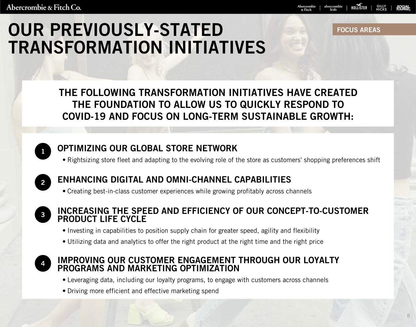 FOCUS AREAS OPTIMIZING OUR GLOBAL STORE NETWORK • Rightsizing store fleet and adapting to the evolving role of the store as customers' shopping preferences shift ENHANCING DIGITAL AND OMNI-CHANNEL CAPABILITIES • Creating best-in-class customer experiences while growing profitably across channels INCREASING THE SPEED AND EFFICIENCY OF OUR CONCEPT-TO-CUSTOMER PRODUCT LIFE CYCLE • Investing in capabilities to position supply chain for greater speed, agility and flexibility • Utilizing data and analytics to offer the right product at the right time and the right price IMPROVING OUR CUSTOMER ENGAGEMENT THROUGH OUR LOYALTY PROGRAMS AND MARKETING OPTIMIZATION • Leveraging data, including our loyalty programs, to engage with customers across channels • Driving more efficient and effective marketing spend 1 2 3 4 THE FOLLOWING TRANSFORMATION INITIATIVES HAVE CREATED THE FOUNDATION TO ALLOW US TO QUICKLY RESPOND TO COVID-19 AND FOCUS ON LONG-TERM SUSTAINABLE GROWTH: OUR PREVIOUSLY-STATED TRANSFORMATION INITIATIVES 8