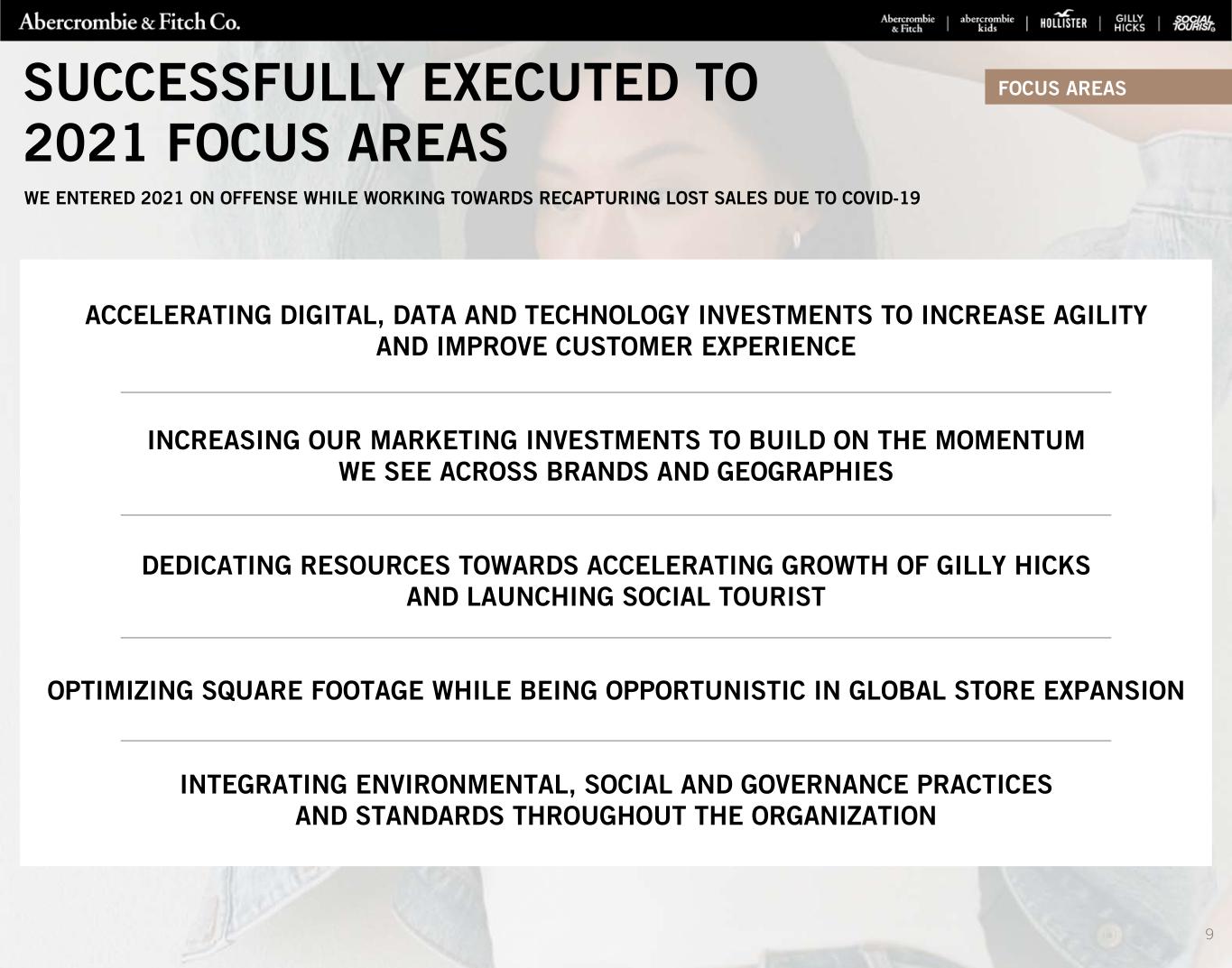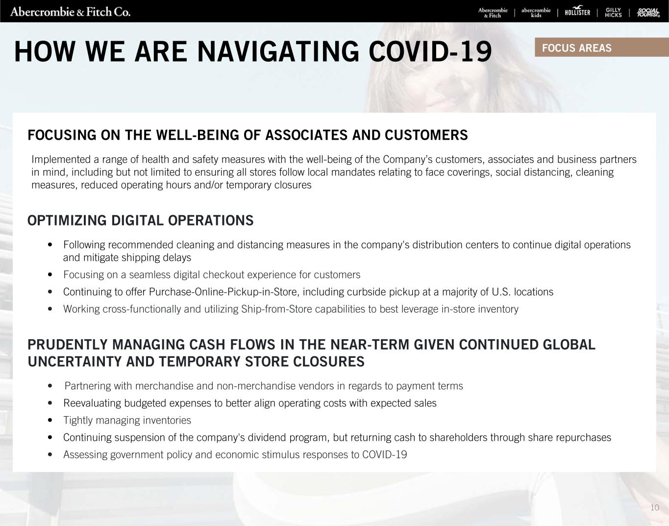 SUCCESSFULLY EXECUTED TO 2021 FOCUS AREAS ACCELERATING DIGITAL, DATA AND TECHNOLOGY INVESTMENTS TO INCREASE AGILITY AND IMPROVE CUSTOMER EXPERIENCE INCREASING OUR MARKETING INVESTMENTS TO BUILD ON THE MOMENTUM WE SEE ACROSS BRANDS AND GEOGRAPHIES DEDICATING RESOURCES TOWARDS ACCELERATING GROWTH OF GILLY HICKS AND LAUNCHING SOCIAL TOURIST OPTIMIZING SQUARE FOOTAGE WHILE BEING OPPORTUNISTIC IN GLOBAL STORE EXPANSION INTEGRATING ENVIRONMENTAL, SOCIAL AND GOVERNANCE PRACTICES AND STANDARDS THROUGHOUT THE ORGANIZATION FOCUS AREAS WE ENTERED 2021 ON OFFENSE WHILE WORKING TOWARDS RECAPTURING LOST SALES DUE TO COVID-19 9