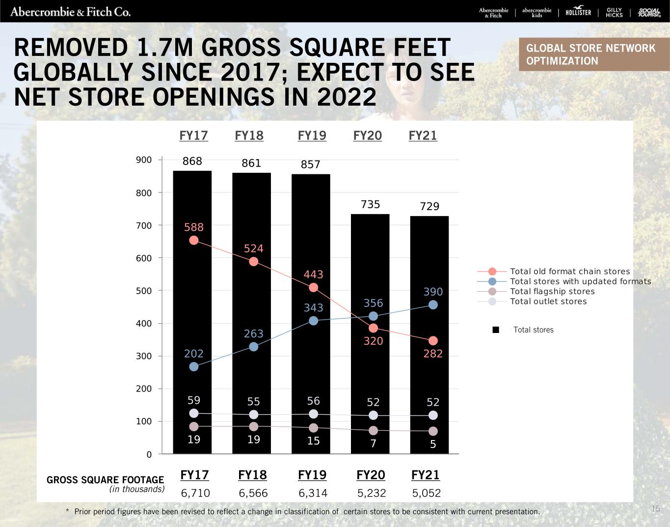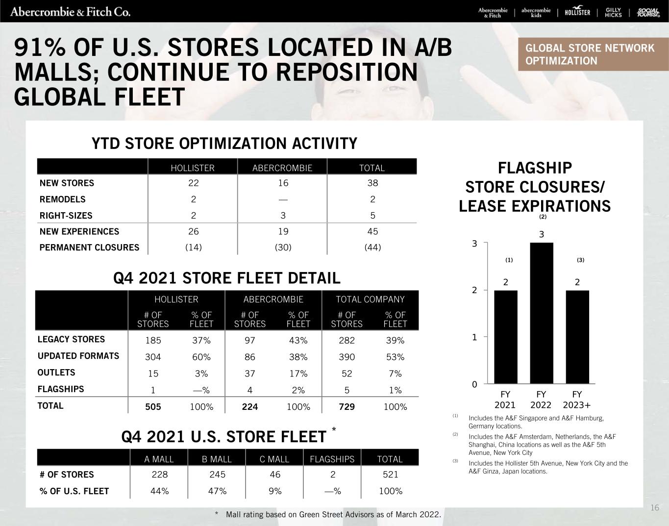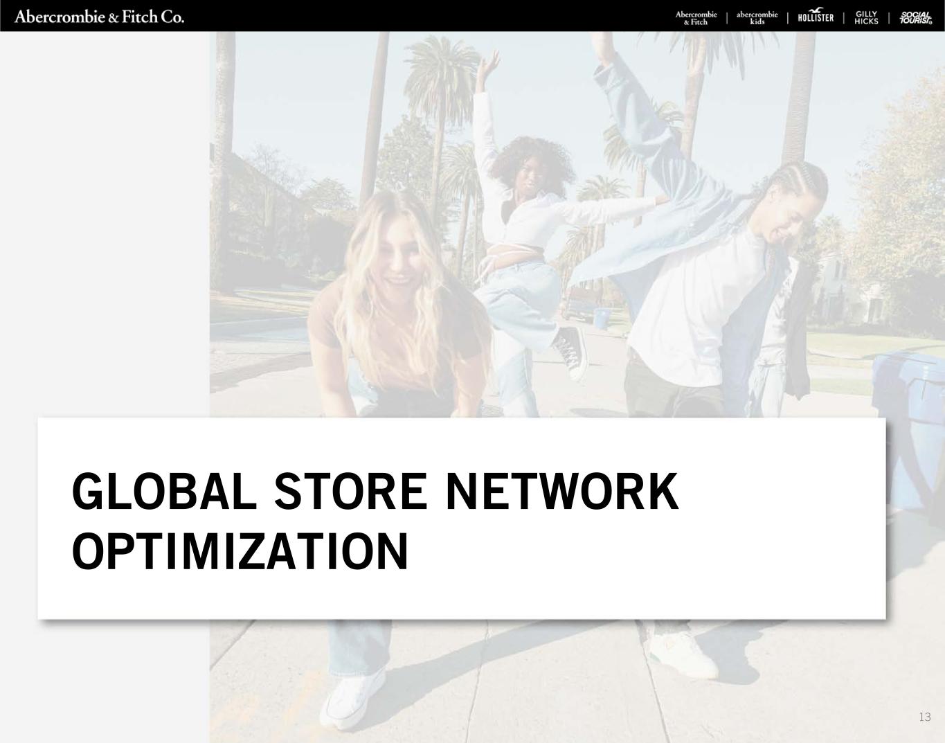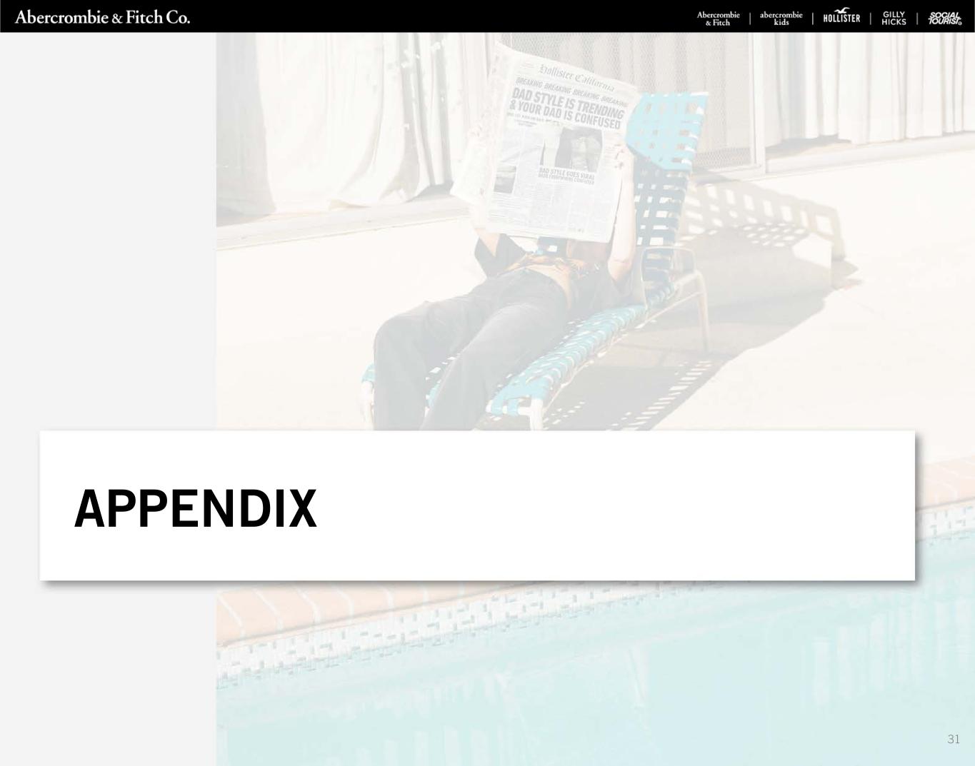 729 STORES AS OF FY21 NEW STORE OPENINGS & CLOSINGS (1) Store count excludes one international third-party operated multi-brand outlet store as of January 29, 2022. (2) Locations with Gilly Hicks carveouts within Hollister stores are represented as a single store count. Excludes 9 international franchise stores as of January 29, 2022 and January 30, 2021. Excludes 14Company-operated temporary stores as of January 29, 2022 and 12 as of January 30, 2021. (3) Locations with abercrombie kids carveouts within Abercrombie & Fitch stores are represented as a single store count. Excludes 14 international franchise stores as of January 29, 2022, and 10 international franchise stores as of January 30, 2021. Excludes five Company-operated temporary stores as of January 29, 2022 and two as of January 30, 2021. TOTAL COMPANY (1) TOTAL UNITED STATES CANADA EUROPE ASIA MIDDLE EAST END OF Q4 2020 735 537 17 123 46 12 OPENINGS 38 17 — 14 7 — PERMANENT CLOSINGS (44) (30) (1) (10) (3) — END OF Q4 2021 729 524 16 127 50 12 HOLLISTER (2) TOTAL UNITED STATES CANADA EUROPE ASIA MIDDLE EAST END OF Q4 2020 497 347 10 107 27 6 OPENINGS 22 10 — 8 4 — PERMANENT CLOSINGS (14) (6) — (6) (2) — END OF Q4 2021 505 351 10 109 29 6 ABERCROMBIE (3) TOTAL UNITED STATES CANADA EUROPE ASIA MIDDLE EAST END OF Q4 2020 238 190 7 16 19 6 OPENINGS 16 7 — 6 3 — PERMANENT CLOSINGS (30) (24) (1) (4) (1) — END OF Q4 2021 224 173 6 18 21 6 GLOBAL STORE NETWORK OPTIMIZATION HOLLISTER ABERCROMBIE TOTAL COMPANY (in thousands) U.S. INTERNATIONAL U.S. INTERNATIONAL U.S. INTERNATIONAL TOTAL Q4 2020 2,309 1,219 1,311 393 3,620 1,612 5,232 Q4 2021 2,312 1,212 1,161 367 3,473 1,579 5,052 GROSS SQUARE FOOTAGE 14