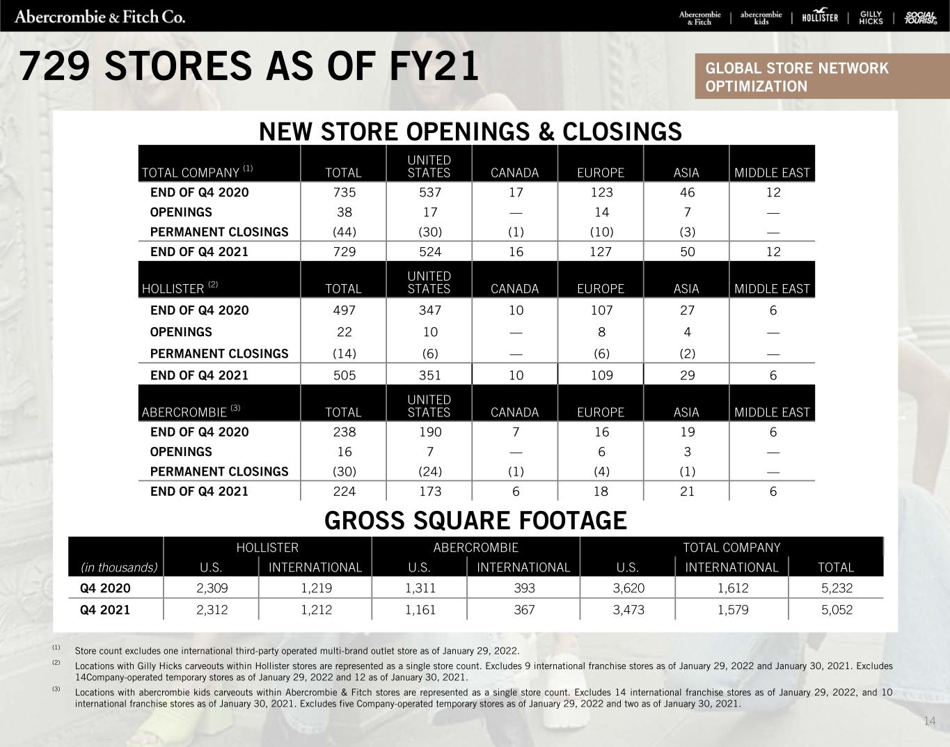 (1)Hollister includes the company’s Hollister and Gilly Hicks brands. Locations with Gilly Hicks carveouts within Hollister stores are represented as a single store count. Excludes 9 international franchise stores as of January 29, 2022, 10 international franchise stores as of October 30, 2021, and 9 international franchise stores as of January 30, 2021. Excludes 14 Company-operated temporary stores as of each of January 29, 2022 and October 30, 2021, and 12 Company-operated temporary stores as of January 30, 2021.