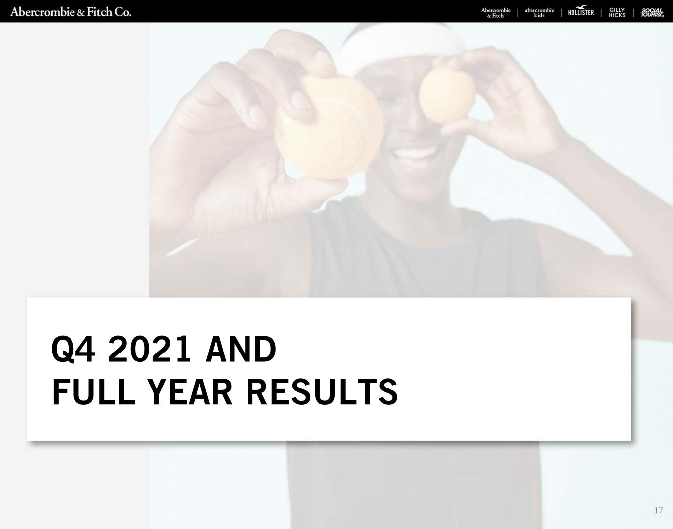 91% OF U.S. STORES LOCATED IN A/B MALLS; CONTINUE TO REPOSITION GLOBAL FLEET * Mall rating based on Green Street Advisors as of March 2022. YTD STORE OPTIMIZATION ACTIVITY Q4 2021 STORE FLEET DETAIL HOLLISTER ABERCROMBIE TOTAL COMPANY # OF STORES % OF FLEET # OF STORES % OF FLEET # OF STORES % OF FLEET LEGACY STORES 185 37% 97 43% 282 39% UPDATED FORMATS 304 60% 86 38% 390 53% OUTLETS 15 3% 37 17% 52 7% FLAGSHIPS 1 —% 4 2% 5 1% TOTAL 505 100% 224 100% 729 100% HOLLISTER ABERCROMBIE TOTAL NEW STORES 22 16 38 REMODELS 2 — 2 RIGHT-SIZES 2 3 5 NEW EXPERIENCES 26 19 45 PERMANENT CLOSURES (14) (30) (44) FLAGSHIP STORE CLOSURES/ LEASE EXPIRATIONS (1) (1) Includes the A&F Singapore and A&F Hamburg, Germany locations. (2) Includes the A&F Amsterdam, Netherlands, the A&F Shanghai, China locations as well as the A&F 5th Avenue, New York City (3) Includes the Hollister 5th Avenue, New York City and the A&F Ginza, Japan locations. (2) Q4 2021 U.S. STORE FLEET * A MALL B MALL C MALL FLAGSHIPS TOTAL # OF STORES 228 245 46 2 521 % OF U.S. FLEET 44% 47% 9% —% 100% (3) GLOBAL STORE NETWORK OPTIMIZATION 16