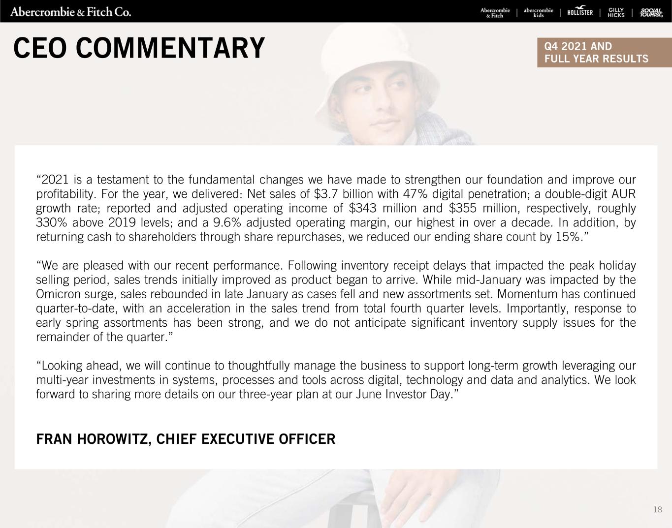 “2021 is a testament to the fundamental changes we have made to strengthen our foundation and improve our profitability. For the year, we delivered: Net sales of $3.7 billion with 47% digital penetration; a double-digit AUR growth rate; reported and adjusted operating income of $343 million and $355 million, respectively, roughly 330% above 2019 levels; and a 9.6% adjusted operating margin, our highest in over a decade. In addition, by returning cash to shareholders through share repurchases, we reduced our ending share count by 15%.” “We are pleased with our recent performance. Following inventory receipt delays that impacted the peak holiday selling period, sales trends initially improved as product began to arrive. While mid-January was impacted by the Omicron surge, sales rebounded in late January as cases fell and new assortments set. Momentum has continued quarter-to-date, with an acceleration in the sales trend from total fourth quarter levels. Importantly, response to early spring assortments has been strong, and we do not anticipate significant inventory supply issues for the remainder of the quarter.” “Looking ahead, we will continue to thoughtfully manage the business to support long-term growth leveraging our multi-year investments in systems, processes and tools across digital, technology and data and analytics. We look forward to sharing more details on our three-year plan at our June Investor Day.” FRAN HOROWITZ, CHIEF EXECUTIVE OFFICER CEO COMMENTARY Q4 2021 AND FULL YEAR RESULTS 18