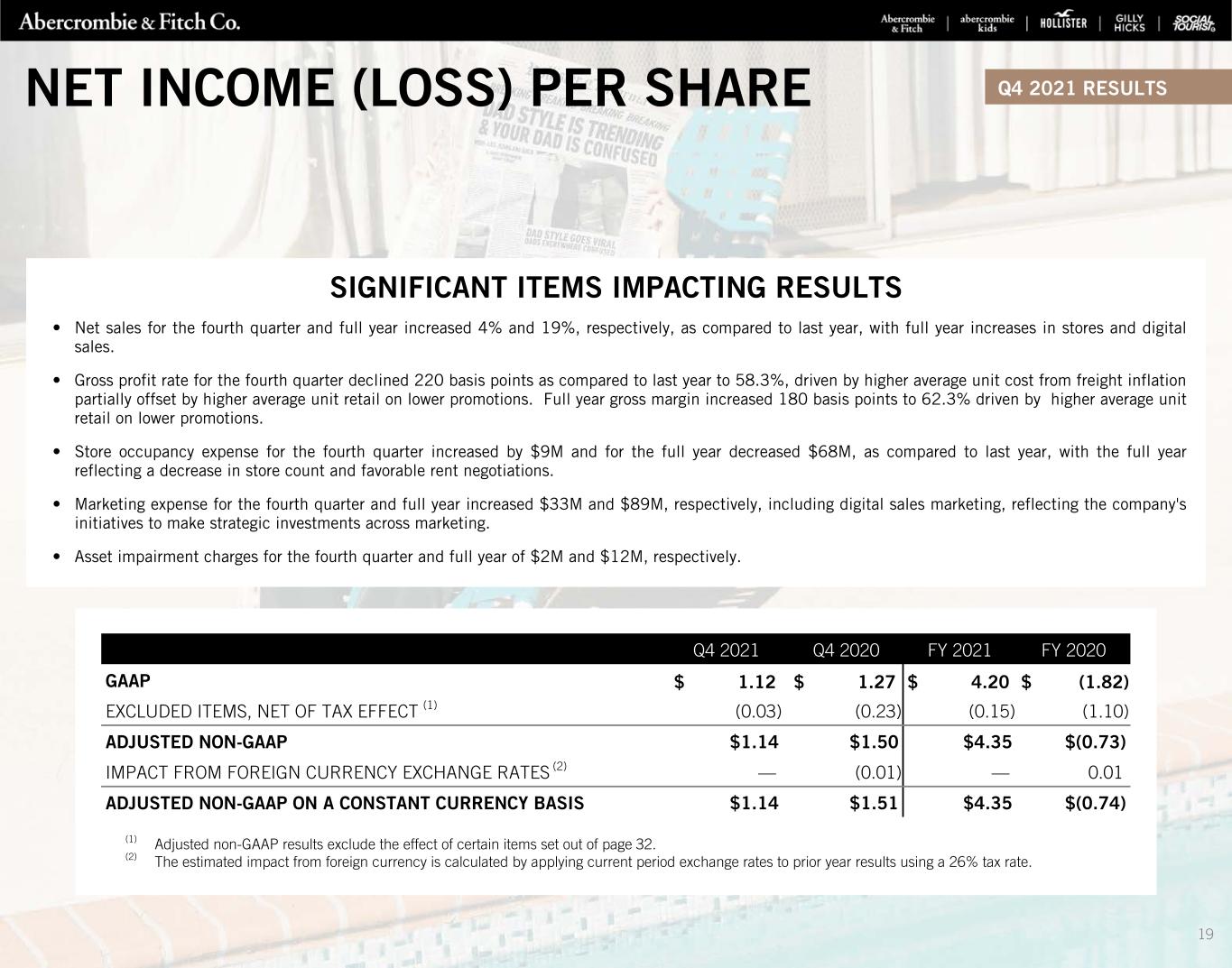 Q4 2021 RESULTS SIGNIFICANT ITEMS IMPACTING RESULTS • Net sales for the fourth quarter and full year increased 4% and 19%, respectively, as compared to last year, with full year increases in stores and digital sales. • Gross profit rate for the fourth quarter declined 220 basis points as compared to last year to 58.3%, driven by higher average unit cost from freight inflation partially offset by higher average unit retail on lower promotions. Full year gross margin increased 180 basis points to 62.3% driven by higher average unit retail on lower promotions. • Store occupancy expense for the fourth quarter increased by $9M and for the full year decreased $68M, as compared to last year, with the full year reflecting a decrease in store count and favorable rent negotiations. • Marketing expense for the fourth quarter and full year increased $33M and $89M, respectively, including digital sales marketing, reflecting the company's initiatives to make strategic investments across marketing. • Asset impairment charges for the fourth quarter and full year of $2M and $12M, respectively. (1) Adjusted non-GAAP results exclude the effect of certain items set out of page 32. (2) The estimated impact from foreign currency is calculated by applying current period exchange rates to prior year results using a 26% tax rate. Q4 2021 Q4 2020 FY 2021 FY 2020 GAAP $ 1.12 $ 1.27 $ 4.20 $ (1.82) EXCLUDED ITEMS, NET OF TAX EFFECT (1) (0.03) (0.23) (0.15) (1.10) ADJUSTED NON-GAAP $1.14 $1.50 $4.35 $(0.73) IMPACT FROM FOREIGN CURRENCY EXCHANGE RATES (2) — (0.01) — 0.01 ADJUSTED NON-GAAP ON A CONSTANT CURRENCY BASIS $1.14 $1.51 $4.35 $(0.74) NET INCOME (LOSS) PER SHARE 19