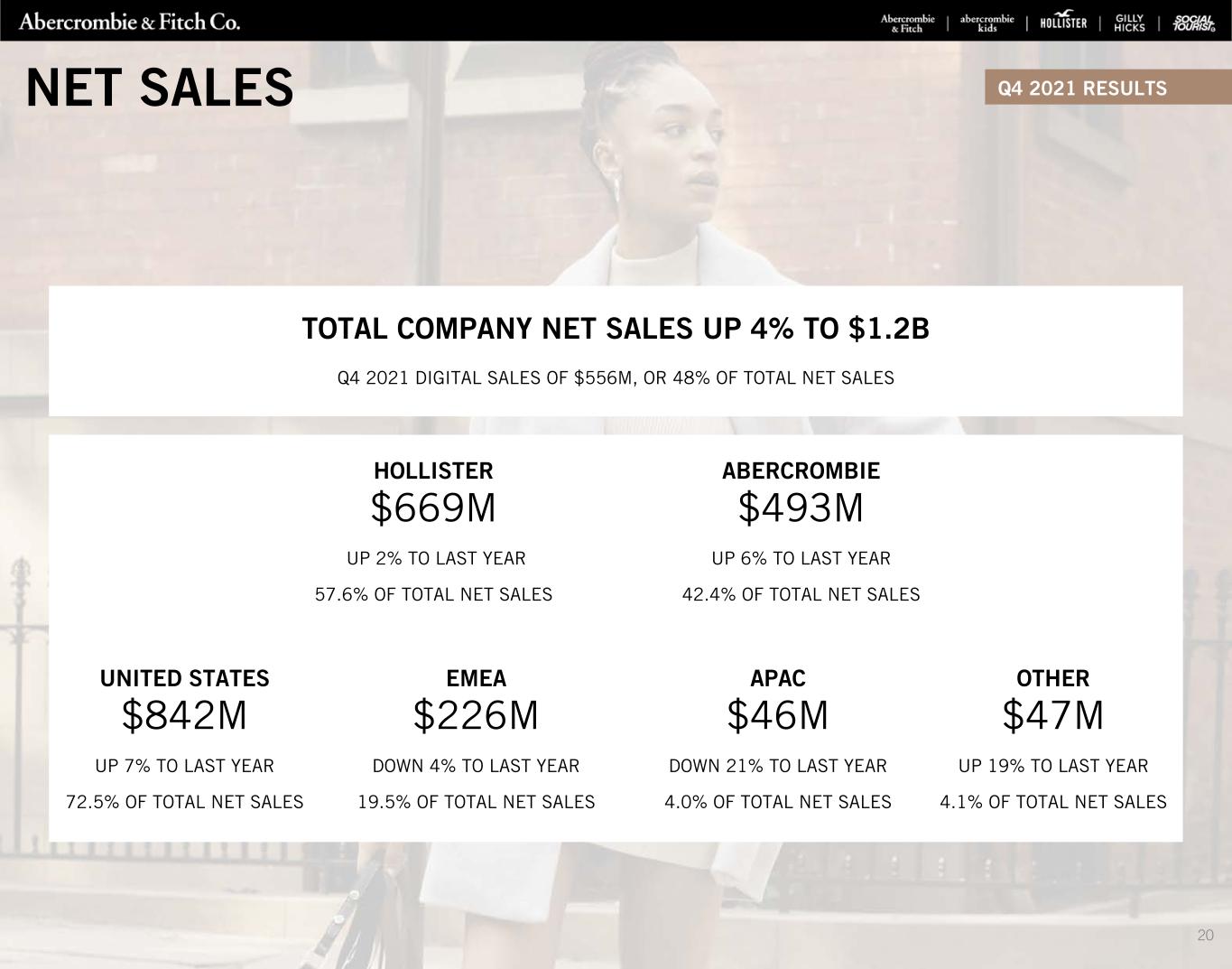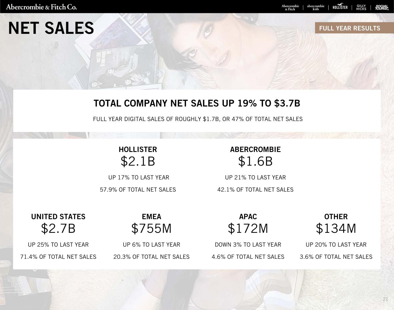 ABERCROMBIE $1.6B UP 21% TO LAST YEAR 42.1% OF TOTAL NET SALES HOLLISTER $2.1B UP 17% TO LAST YEAR 57.9% OF TOTAL NET SALES EMEA $755M UP 6% TO LAST YEAR 20.3% OF TOTAL NET SALES UNITED STATES $2.7B UP 25% TO LAST YEAR 71.4% OF TOTAL NET SALES TOTAL COMPANY NET SALES UP 19% TO $3.7B FULL YEAR DIGITAL SALES OF ROUGHLY $1.7B, OR 47% OF TOTAL NET SALES APAC $172M DOWN 3% TO LAST YEAR 4.6% OF TOTAL NET SALES OTHER $134M UP 20% TO LAST YEAR 3.6% OF TOTAL NET SALES NET SALES FULL YEAR RESULTS 21