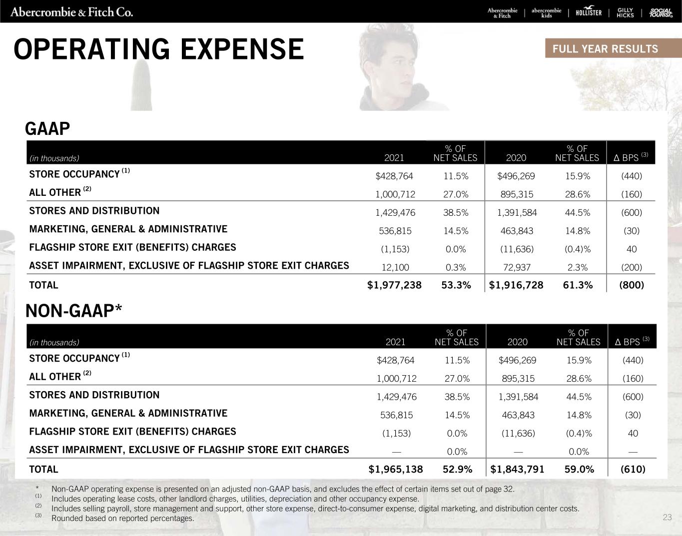 GAAP NON-GAAP* * Non-GAAP operating expense is presented on an adjusted non-GAAP basis, and excludes the effect of certain items set out of page 32. (1) Includes operating lease costs, other landlord charges, utilities, depreciation and other occupancy expense. (2) Includes selling payroll, store management and support, other store expense, direct-to-consumer expense, digital marketing, and distribution center costs. (3) Rounded based on reported percentages. (in thousands) 2021 % OF NET SALES 2020 % OF NET SALES Δ BPS (3) STORE OCCUPANCY (1) $428,764 11.5% $496,269 15.9% (440) ALL OTHER (2) 1,000,712 27.0% 895,315 28.6% (160) STORES AND DISTRIBUTION 1,429,476 38.5% 1,391,584 44.5% (600) MARKETING, GENERAL & ADMINISTRATIVE 536,815 14.5% 463,843 14.8% (30) FLAGSHIP STORE EXIT (BENEFITS) CHARGES (1,153) 0.0% (11,636) (0.4)% 40 ASSET IMPAIRMENT, EXCLUSIVE OF FLAGSHIP STORE EXIT CHARGES 12,100 0.3% 72,937 2.3% (200) TOTAL $1,977,238 53.3% $1,916,728 61.3% (800) (in thousands) 2021 % OF NET SALES 2020 % OF NET SALES Δ BPS (3) STORE OCCUPANCY (1) $428,764 11.5% $496,269 15.9% (440) ALL OTHER (2) 1,000,712 27.0% 895,315 28.6% (160) STORES AND DISTRIBUTION 1,429,476 38.5% 1,391,584 44.5% (600) MARKETING, GENERAL & ADMINISTRATIVE 536,815 14.5% 463,843 14.8% (30) FLAGSHIP STORE EXIT (BENEFITS) CHARGES (1,153) 0.0% (11,636) (0.4)% 40 ASSET IMPAIRMENT, EXCLUSIVE OF FLAGSHIP STORE EXIT CHARGES — 0.0% — 0.0% — TOTAL $1,965,138 52.9% $1,843,791 59.0% (610) OPERATING EXPENSE FULL YEAR RESULTS 23