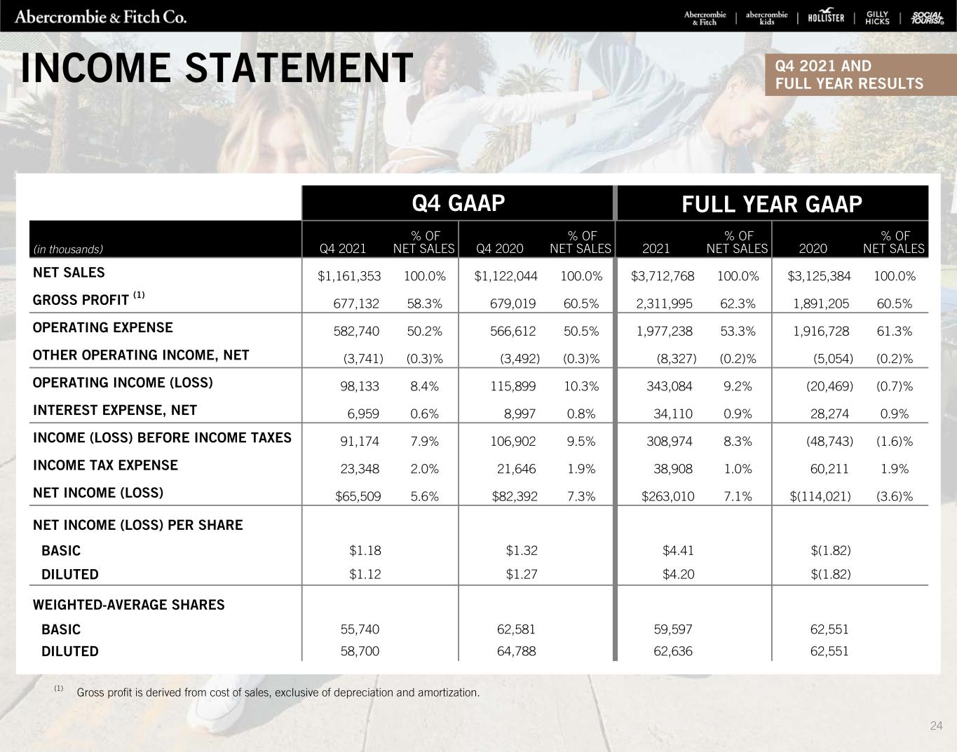(1) Gross profit is derived from cost of sales, exclusive of depreciation and amortization. Q4 GAAP FULL YEAR GAAP (in thousands) Q4 2021 % OF NET SALES Q4 2020 % OF NET SALES 2021 % OF NET SALES 2020 % OF NET SALES NET SALES $1,161,353 100.0% $1,122,044 100.0% $3,712,768 100.0% $3,125,384 100.0% GROSS PROFIT (1) 677,132 58.3% 679,019 60.5% 2,311,995 62.3% 1,891,205 60.5% OPERATING EXPENSE 582,740 50.2% 566,612 50.5% 1,977,238 53.3% 1,916,728 61.3% OTHER OPERATING INCOME, NET (3,741) (0.3)% (3,492) (0.3)% (8,327) (0.2)% (5,054) (0.2)% OPERATING INCOME (LOSS) 98,133 8.4% 115,899 10.3% 343,084 9.2% (20,469) (0.7)% INTEREST EXPENSE, NET 6,959 0.6% 8,997 0.8% 34,110 0.9% 28,274 0.9% INCOME (LOSS) BEFORE INCOME TAXES 91,174 7.9% 106,902 9.5% 308,974 8.3% (48,743) (1.6)% INCOME TAX EXPENSE 23,348 2.0% 21,646 1.9% 38,908 1.0% 60,211 1.9% NET INCOME (LOSS) $65,509 5.6% $82,392 7.3% $263,010 7.1% $(114,021) (3.6)% NET INCOME (LOSS) PER SHARE BASIC $1.18 $1.32 $4.41 $(1.82) DILUTED $1.12 $1.27 $4.20 $(1.82) WEIGHTED-AVERAGE SHARES BASIC 55,740 62,581 59,597 62,551 DILUTED 58,700 64,788 62,636 62,551 INCOME STATEMENT Q4 2021 AND FULL YEAR RESULTS 24