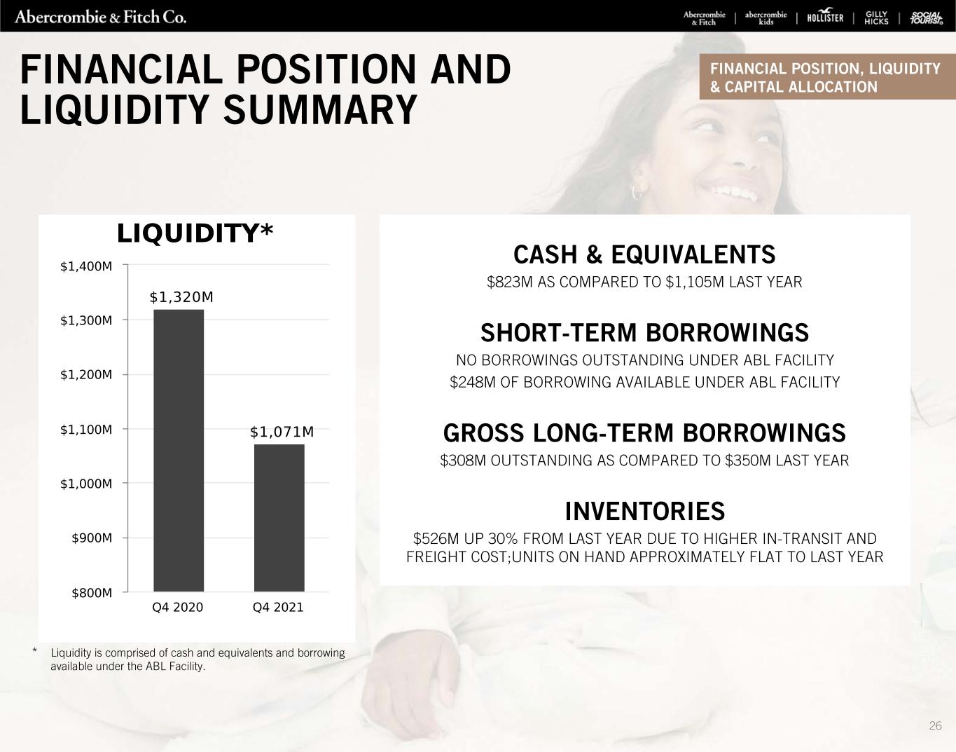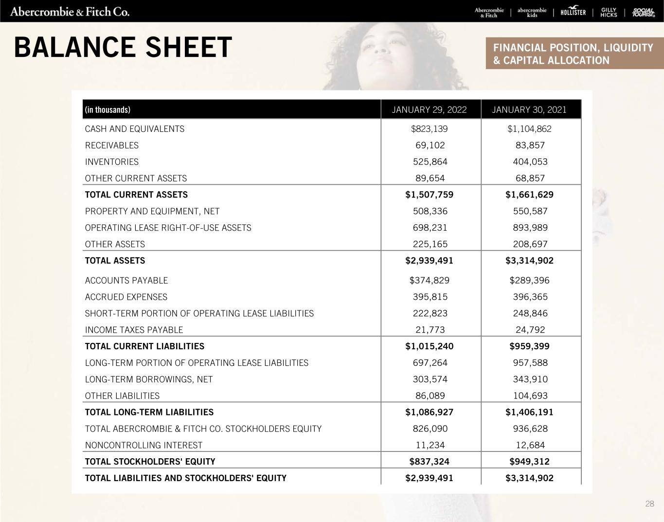 (in thousands) JANUARY 29, 2022 JANUARY 30, 2021 CASH AND EQUIVALENTS $823,139 $1,104,862 RECEIVABLES 69,102 83,857 INVENTORIES 525,864 404,053 OTHER CURRENT ASSETS 89,654 68,857 TOTAL CURRENT ASSETS $1,507,759 $1,661,629 PROPERTY AND EQUIPMENT, NET 508,336 550,587 OPERATING LEASE RIGHT-OF-USE ASSETS 698,231 893,989 OTHER ASSETS 225,165 208,697 TOTAL ASSETS $2,939,491 $3,314,902 ACCOUNTS PAYABLE $374,829 $289,396 ACCRUED EXPENSES 395,815 396,365 SHORT-TERM PORTION OF OPERATING LEASE LIABILITIES 222,823 248,846 INCOME TAXES PAYABLE 21,773 24,792 TOTAL CURRENT LIABILITIES $1,015,240 $959,399 LONG-TERM PORTION OF OPERATING LEASE LIABILITIES 697,264 957,588 LONG-TERM BORROWINGS, NET 303,574 343,910 OTHER LIABILITIES 86,089 104,693 TOTAL LONG-TERM LIABILITIES $1,086,927 $1,406,191 TOTAL ABERCROMBIE & FITCH CO. STOCKHOLDERS EQUITY 826,090 936,628 NONCONTROLLING INTEREST 11,234 12,684 TOTAL STOCKHOLDERS' EQUITY $837,324 $949,312 TOTAL LIABILITIES AND STOCKHOLDERS' EQUITY $2,939,491 $3,314,902 BALANCE SHEET FINANCIAL POSITION, LIQUIDITY & CAPITAL ALLOCATION 28