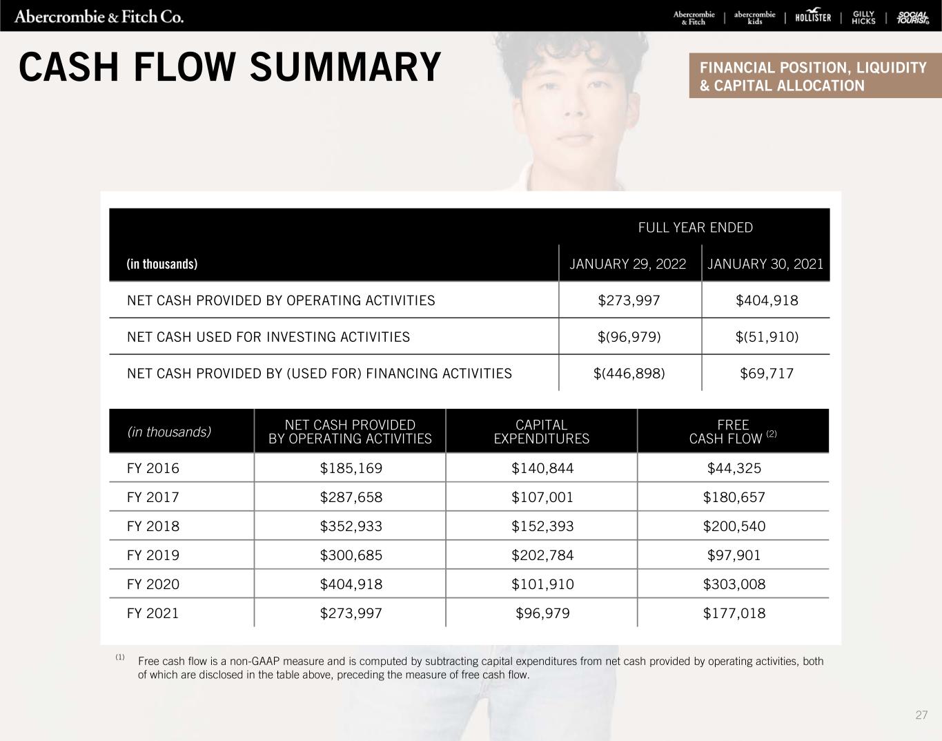 (in thousands) NET CASH PROVIDED BY OPERATING ACTIVITIES CAPITAL EXPENDITURES FREE CASH FLOW (2) FY 2016 $185,169 $140,844 $44,325 FY 2017 $287,658 $107,001 $180,657 FY 2018 $352,933 $152,393 $200,540 FY 2019 $300,685 $202,784 $97,901 FY 2020 $404,918 $101,910 $303,008 FY 2021 $273,997 $96,979 $177,018 (1) Free cash flow is a non-GAAP measure and is computed by subtracting capital expenditures from net cash provided by operating activities, both of which are disclosed in the table above, preceding the measure of free cash flow. FULL YEAR ENDED (in thousands) JANUARY 29, 2022 JANUARY 30, 2021 NET CASH PROVIDED BY OPERATING ACTIVITIES $273,997 $404,918 NET CASH USED FOR INVESTING ACTIVITIES $(96,979) $(51,910) NET CASH PROVIDED BY (USED FOR) FINANCING ACTIVITIES $(446,898) $69,717 CASH FLOW SUMMARY FINANCIAL POSITION, LIQUIDITY & CAPITAL ALLOCATION 27