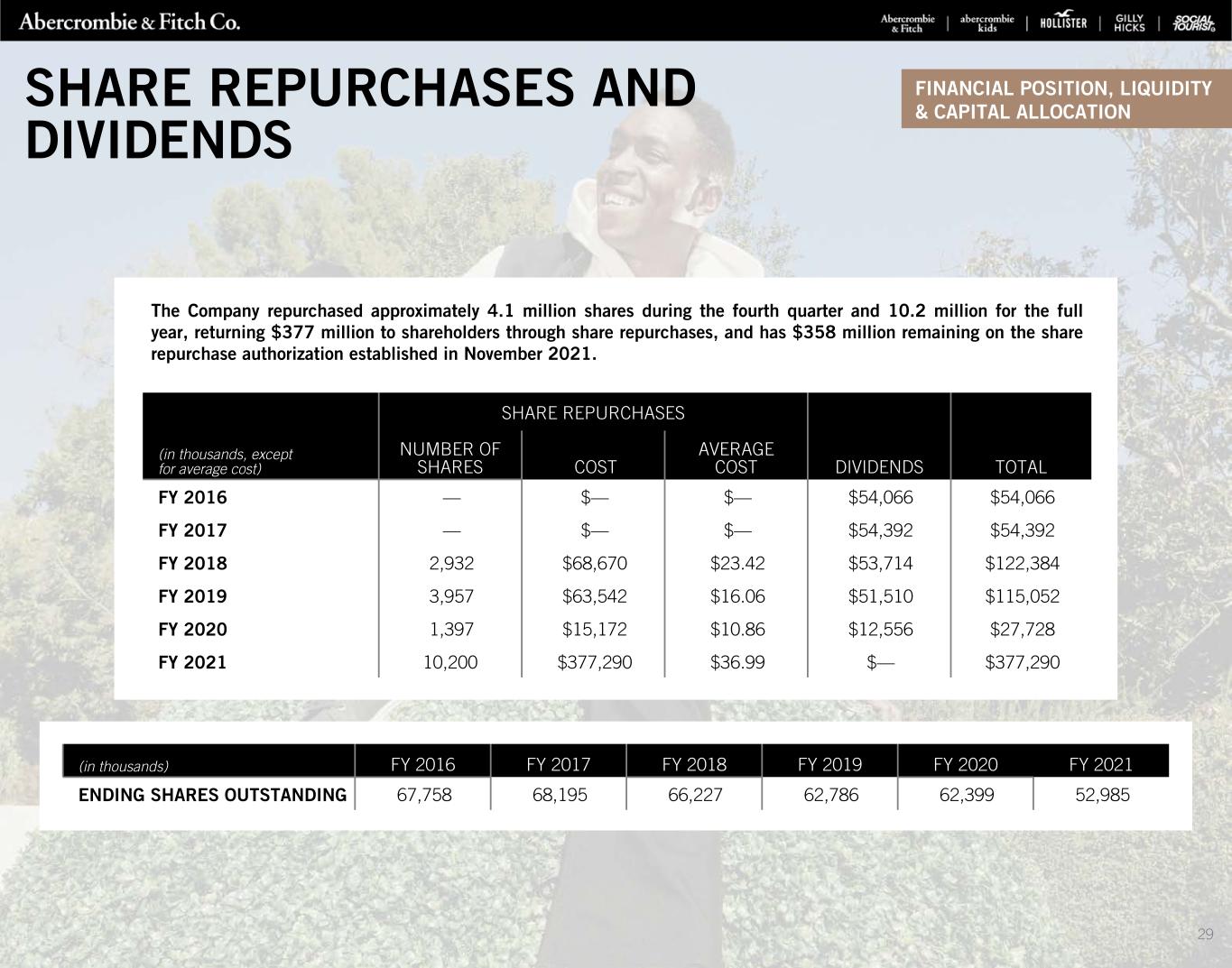 SHARE REPURCHASES (in thousands, except for average cost) NUMBER OF SHARES COST AVERAGE COST DIVIDENDS TOTAL FY 2016 — $— $— $54,066 $54,066 FY 2017 — $— $— $54,392 $54,392 FY 2018 2,932 $68,670 $23.42 $53,714 $122,384 FY 2019 3,957 $63,542 $16.06 $51,510 $115,052 FY 2020 1,397 $15,172 $10.86 $12,556 $27,728 FY 2021 10,200 $377,290 $36.99 $— $377,290 The Company repurchased approximately 4.1 million shares during the fourth quarter and 10.2 million for the full year, returning $377 million to shareholders through share repurchases, and has $358 million remaining on the share repurchase authorization established in November 2021. (in thousands) FY 2016 FY 2017 FY 2018 FY 2019 FY 2020 FY 2021 ENDING SHARES OUTSTANDING 67,758 68,195 66,227 62,786 62,399 52,985 FINANCIAL POSITION, LIQUIDITY & CAPITAL ALLOCATION SHARE REPURCHASES AND DIVIDENDS 29