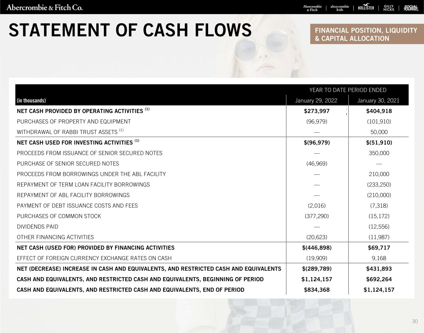 YEAR TO DATE PERIOD ENDED (in thousands) January 29, 2022 January 30, 2021 NET CASH PROVIDED BY OPERATING ACTIVITIES (1) $273,997 5 9 $404,918 PURCHASES OF PROPERTY AND EQUIPMENT (96,979) (101,910) WITHDRAWAL OF RABBI TRUST ASSETS (1) — 50,000 NET CASH USED FOR INVESTING ACTIVITIES (1) $(96,979) $(51,910) PROCEEDS FROM ISSUANCE OF SENIOR SECURED NOTES — 350,000 PURCHASE OF SENIOR SECURED NOTES (46,969) — PROCEEDS FROM BORROWINGS UNDER THE ABL FACILITY — 210,000 REPAYMENT OF TERM LOAN FACILITY BORROWINGS — (233,250) REPAYMENT OF ABL FACILITY BORROWINGS — (210,000) PAYMENT OF DEBT ISSUANCE COSTS AND FEES (2,016) (7,318) PURCHASES OF COMMON STOCK (377,290) (15,172) DIVIDENDS PAID — (12,556) OTHER FINANCING ACTIVITIES (20,623) (11,987) NET CASH (USED FOR) PROVIDED BY FINANCING ACTIVITIES $(446,898) $69,717 EFFECT OF FOREIGN CURRENCY EXCHANGE RATES ON CASH (19,909) 9,168 NET (DECREASE) INCREASE IN CASH AND EQUIVALENTS, AND RESTRICTED CASH AND EQUIVALENTS $(289,789) $431,893 CASH AND EQUIVALENTS, AND RESTRICTED CASH AND EQUIVALENTS, BEGINNING OF PERIOD $1,124,157 $692,264 CASH AND EQUIVALENTS, AND RESTRICTED CASH AND EQUIVALENTS, END OF PERIOD $834,368 $1,124,157 FINANCIAL POSITION, LIQUIDITY & CAPITAL ALLOCATION STATEMENT OF CASH FLOWS 30