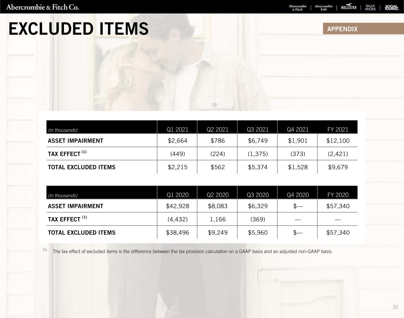 (in thousands) Q1 2020 Q2 2020 Q3 2020 Q4 2020 FY 2020 ASSET IMPAIRMENT $42,928 $8,083 $6,329 $— $57,340 TAX EFFECT (1) (4,432) 1,166 (369) — — TOTAL EXCLUDED ITEMS $38,496 $9,249 $5,960 $— $57,340 (in thousands) Q1 2021 Q2 2021 Q3 2021 Q4 2021 FY 2021 ASSET IMPAIRMENT $2,664 $786 $6,749 $1,901 $12,100 TAX EFFECT (1) (449) (224) (1,375) (373) (2,421) TOTAL EXCLUDED ITEMS $2,215 $562 $5,374 $1,528 $9,679 (1) The tax effect of excluded items is the difference between the tax provision calculation on a GAAP basis and an adjusted non-GAAP basis. EXCLUDED ITEMS APPENDIX 32