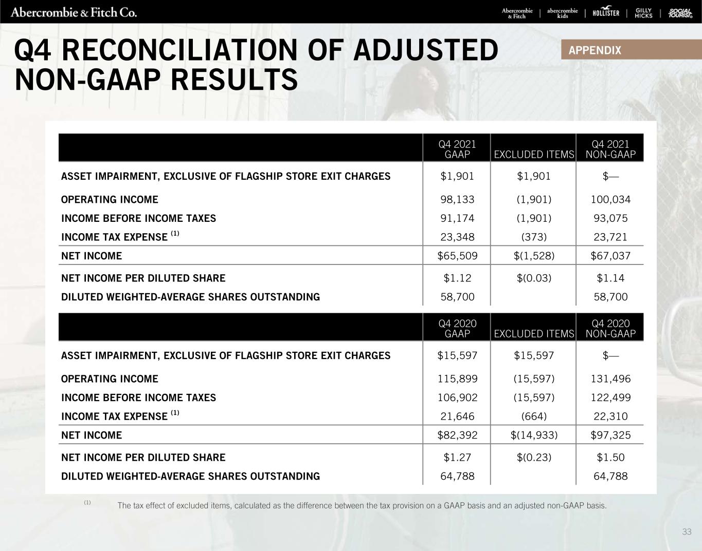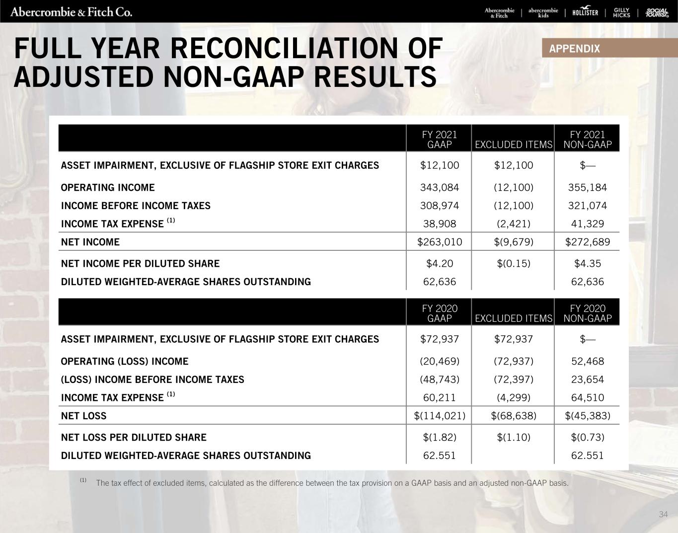 Q4 RECONCILIATION OF ADJUSTED NON-GAAP RESULTS Q4 2021 GAAP EXCLUDED ITEMS Q4 2021 NON-GAAP ASSET IMPAIRMENT, EXCLUSIVE OF FLAGSHIP STORE EXIT CHARGES $1,901 $1,901 $— OPERATING INCOME 98,133 (1,901) 100,034 INCOME BEFORE INCOME TAXES 91,174 (1,901) 93,075 INCOME TAX EXPENSE (1) 23,348 (373) 23,721 NET INCOME $65,509 $(1,528) $67,037 NET INCOME PER DILUTED SHARE $1.12 $(0.03) $1.14 DILUTED WEIGHTED-AVERAGE SHARES OUTSTANDING 58,700 58,700 Q4 2020 GAAP EXCLUDED ITEMS Q4 2020 NON-GAAP ASSET IMPAIRMENT, EXCLUSIVE OF FLAGSHIP STORE EXIT CHARGES $15,597 $15,597 $— OPERATING INCOME 115,899 (15,597) 131,496 INCOME BEFORE INCOME TAXES 106,902 (15,597) 122,499 INCOME TAX EXPENSE (1) 21,646 (664) 22,310 NET INCOME $82,392 $(14,933) $97,325 NET INCOME PER DILUTED SHARE $1.27 $(0.23) $1.50 DILUTED WEIGHTED-AVERAGE SHARES OUTSTANDING 64,788 64,788 (1) The tax effect of excluded items, calculated as the difference between the tax provision on a GAAP basis and an adjusted non-GAAP basis. APPENDIX 33
