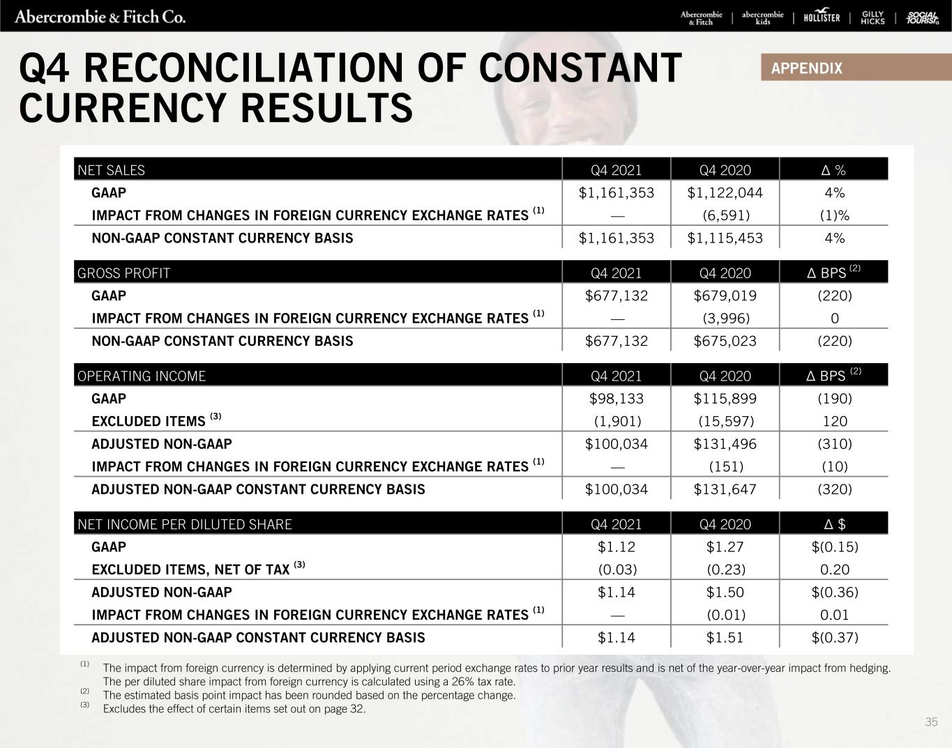 NET SALES Q4 2021 Q4 2020 Δ % GAAP $1,161,353 $1,122,044 4% IMPACT FROM CHANGES IN FOREIGN CURRENCY EXCHANGE RATES (1) — (6,591) (1)% NON-GAAP CONSTANT CURRENCY BASIS $1,161,353 $1,115,453 4% GROSS PROFIT Q4 2021 Q4 2020 Δ BPS (2) GAAP $677,132 $679,019 (220) IMPACT FROM CHANGES IN FOREIGN CURRENCY EXCHANGE RATES (1) — (3,996) 0 NON-GAAP CONSTANT CURRENCY BASIS $677,132 $675,023 (220) OPERATING INCOME Q4 2021 Q4 2020 Δ BPS (2) GAAP $98,133 $115,899 (190) EXCLUDED ITEMS (3) (1,901) (15,597) 120 ADJUSTED NON-GAAP $100,034 $131,496 (310) IMPACT FROM CHANGES IN FOREIGN CURRENCY EXCHANGE RATES (1) — (151) (10) ADJUSTED NON-GAAP CONSTANT CURRENCY BASIS $100,034 $131,647 (320) NET INCOME PER DILUTED SHARE Q4 2021 Q4 2020 Δ $ GAAP $1.12 $1.27 $(0.15) EXCLUDED ITEMS, NET OF TAX (3) (0.03) (0.23) 0.20 ADJUSTED NON-GAAP $1.14 $1.50 $(0.36) IMPACT FROM CHANGES IN FOREIGN CURRENCY EXCHANGE RATES (1) — (0.01) 0.01 ADJUSTED NON-GAAP CONSTANT CURRENCY BASIS $1.14 $1.51 $(0.37) (1) The impact from foreign currency is determined by applying current period exchange rates to prior year results and is net of the year-over-year impact from hedging. The per diluted share impact from foreign currency is calculated using a 26% tax rate. (2) The estimated basis point impact has been rounded based on the percentage change. (3) Excludes the effect of certain items set out on page 32. APPENDIXQ4 RECONCILIATION OF CONSTANT CURRENCY RESULTS 35