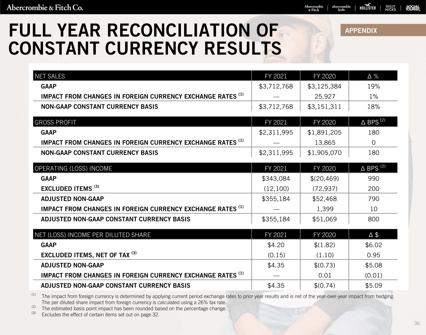 NET SALES FY 2021 FY 2020 Δ % GAAP $3,712,768 $3,125,384 19% IMPACT FROM CHANGES IN FOREIGN CURRENCY EXCHANGE RATES (1) — 25,927 1% NON-GAAP CONSTANT CURRENCY BASIS $3,712,768 $3,151,311 18% GROSS PROFIT FY 2021 FY 2020 Δ BPS (2) GAAP $2,311,995 $1,891,205 180 IMPACT FROM CHANGES IN FOREIGN CURRENCY EXCHANGE RATES (1) — 13,865 0 NON-GAAP CONSTANT CURRENCY BASIS $2,311,995 $1,905,070 180 OPERATING (LOSS) INCOME FY 2021 FY 2020 Δ BPS (2) GAAP $343,084 $(20,469) 990 EXCLUDED ITEMS (3) (12,100) (72,937) 200 ADJUSTED NON-GAAP $355,184 $52,468 790 IMPACT FROM CHANGES IN FOREIGN CURRENCY EXCHANGE RATES (1) — 1,399 10 ADJUSTED NON-GAAP CONSTANT CURRENCY BASIS $355,184 $51,069 800 NET (LOSS) INCOME PER DILUTED SHARE FY 2021 FY 2020 Δ $ GAAP $4.20 $(1.82) $6.02 EXCLUDED ITEMS, NET OF TAX (3) (0.15) (1.10) 0.95 ADJUSTED NON-GAAP $4.35 $(0.73) $5.08 IMPACT FROM CHANGES IN FOREIGN CURRENCY EXCHANGE RATES (1) — 0.01 (0.01) ADJUSTED NON-GAAP CONSTANT CURRENCY BASIS $4.35 $(0.74) $5.09 (1) The impact from foreign currency is determined by applying current period exchange rates to prior year results and is net of the year-over-year impact from hedging. The per diluted share impact from foreign currency is calculated using a 26% tax rate. (2) The estimated basis point impact has been rounded based on the percentage change. (3) Excludes the effect of certain items set out on page 32. APPENDIXFULL YEAR RECONCILIATION OF CONSTANT CURRENCY RESULTS 36